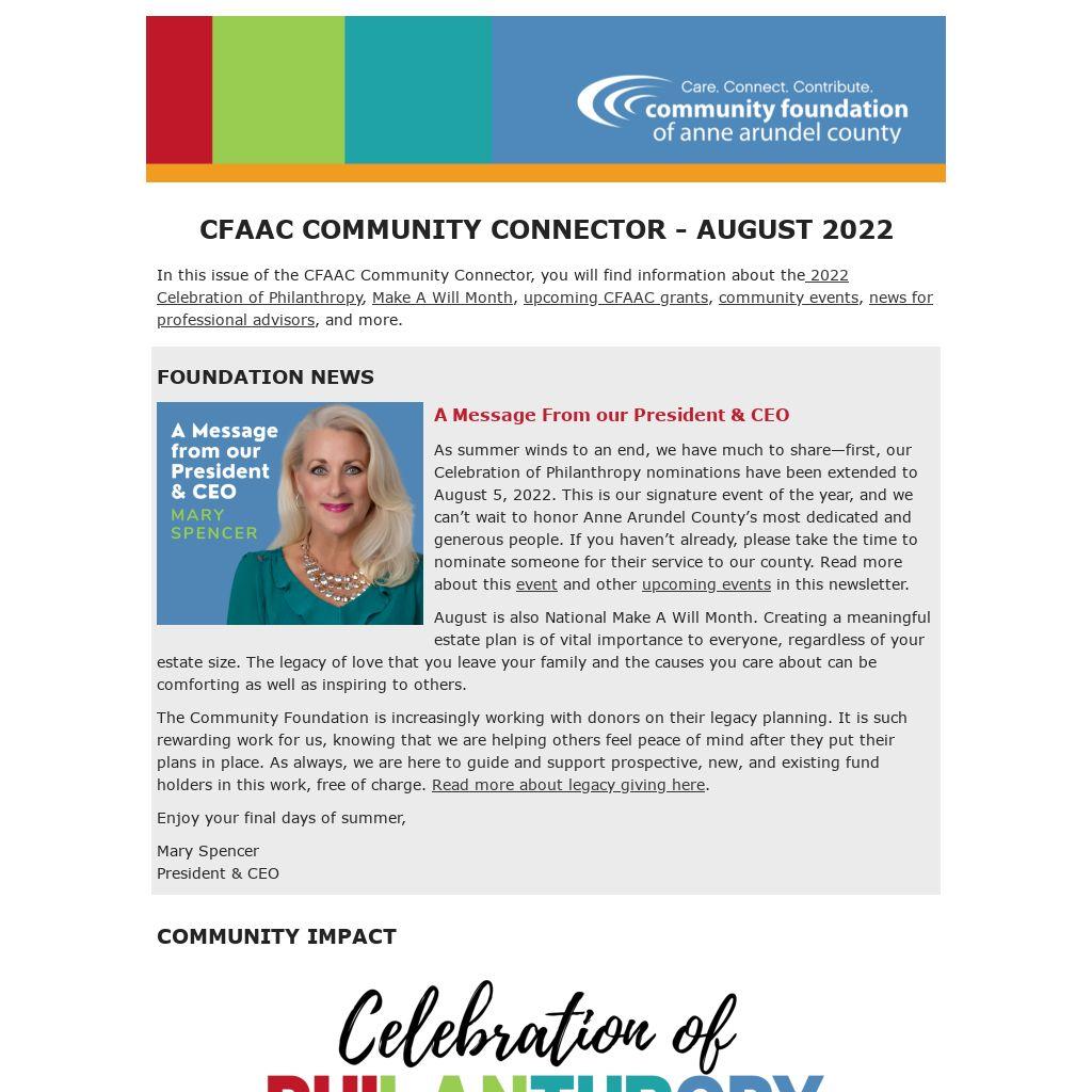 As summer winds to an end, we have much to share—first, our Celebration of Philanthropy nominations have been extended to August 5, 2022. This is our signature event of the year, and we can’t wait to honor Anne Arundel County’s most dedicated and generous people. If you haven’t already, please take the time to nominate someone for their service to our county. Read more about this event and other upcoming events in this newsletter.