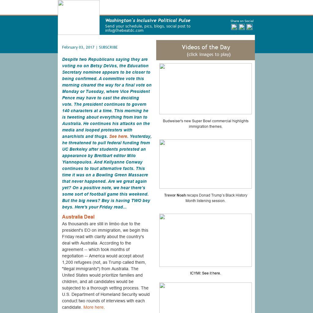 Despite two Republicans saying they are voting no on Betsy DeVos, the Education Secretary nominee appears to be closer to being confirmed. A committee vote this morning cleared the way for a final vote on Monday or Tuesday, where Vice President Pence may have to cast the deciding vote. The president continues to govern 140 characters at a time. This morning he is tweeting about everything from Iran to Australia. He continues his attacks on the media and looped protesters with anarchists and thugs. See here. Yesterday, he threatened to pull federal funding from UC Berkeley after students protested an appearance by Breitbart editor Milo Yiannopoulos. And Kellyanne Conway continues to tout alternative facts. This time it was on a Bowling Green Massacre that never happened. Are we great again yet? On a positive note, we hear there’s some sort of football game this weekend. But the big news? Bey is having TWO bey beys. Here's your Friday read...