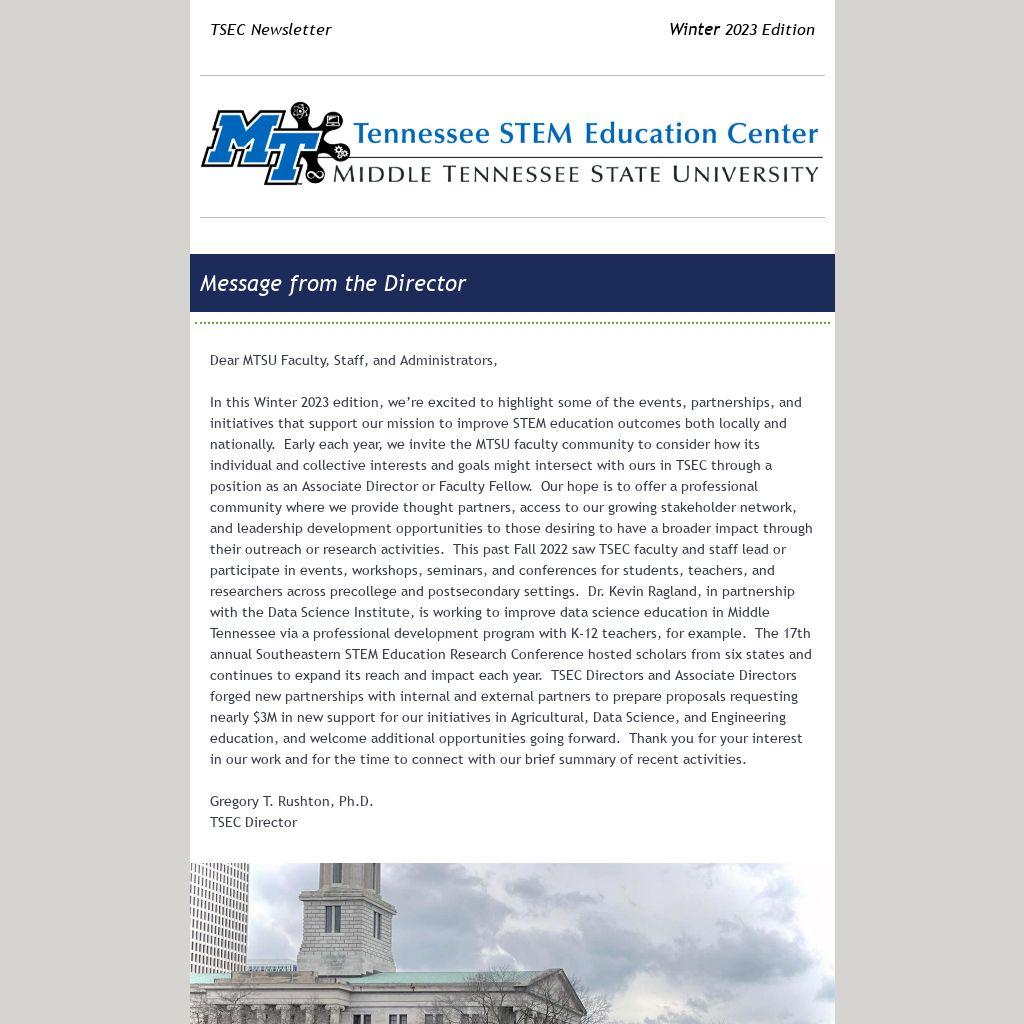 In this Winter 2023 edition, we’re excited to highlight some of the events, partnerships, and initiatives that support our mission to improve STEM education outcomes both locally and nationally. Early each year, we invite the MTSU faculty community to consider how its individual and collective interests and goals might intersect with ours in TSEC through a position as an Associate Director or Faculty Fellow. Our hope is to offer a professional community where we provide thought partners, access to our growing stakeholder network, and leadership development opportunities to those desiring to have a broader impact through their outreach or research activities. This past Fall 2022 saw TSEC faculty and staff lead or participate in events, workshops, seminars, and conferences for students, teachers, and researchers across precollege and postsecondary settings. Dr. Kevin Ragland, in partnership with the Data Science Institute, is working to improve data science education in Middle Tennessee via a professional development program with K-12 teachers, for example. The 17th annual Southeastern STEM Education Research Conference hosted scholars from six states and continues to expand its reach and impact each year. TSEC Directors and Associate Directors forged new partnerships with internal and external partners to prepare proposals requesting nearly $3M in new support for our initiatives in Agricultural, Data Science, and Engineering education, and welcome additional opportunities going forward. Thank you for your interest in our work and for the time to connect with our brief summary of recent activities.