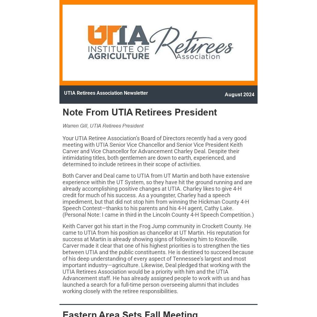 Your UTIA Retiree Association’s Board of Directors recently had a very good meeting with UTIA Senior Vice Chancellor and Senior Vice President Keith Carver and Vice Chancellor for Advancement Charley Deal. Despite their intimidating titles, both gentlemen are down to earth, experienced, and determined to include retirees in their scope of activities.