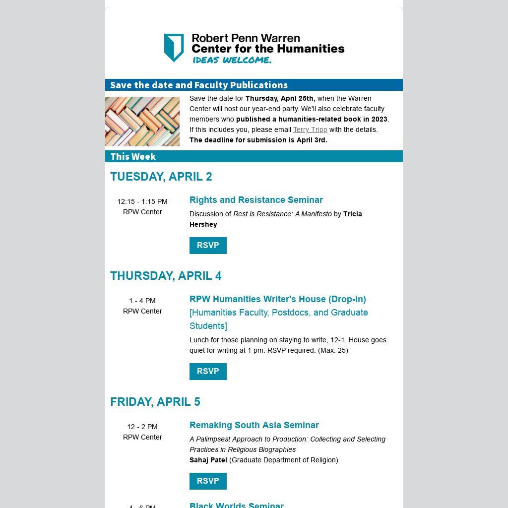 Save the date for Thursday, April 25th, when the Warren Center will host our year-end party. We'll also celebrate faculty members who published a humanities-related book in 2023. If this includes you, please email Terry Tripp with the details. The deadline for submission is April 3rd.