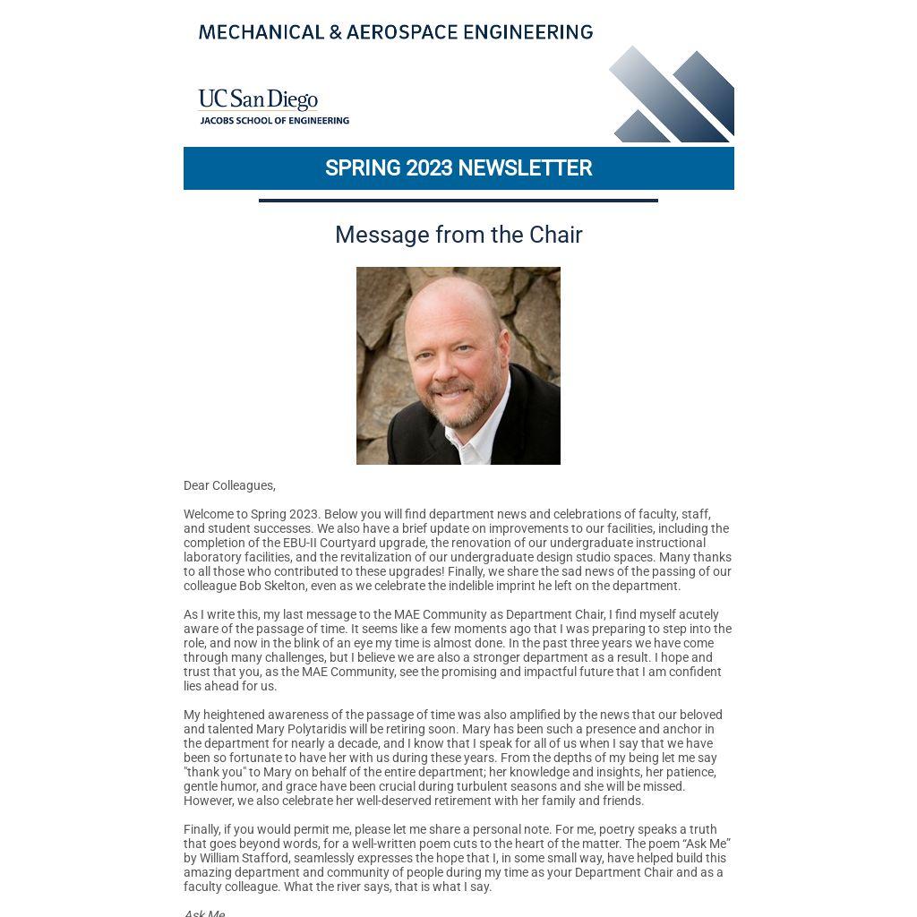 As I write this, my last message to the MAE Community as Department Chair, I find myself acutely aware of the passage of time. It seems like a few moments ago that I was preparing to step into the role, and now in the blink of an eye my time is almost done. In the past three years we have come through many challenges, but I believe we are also a stronger department as a result. I hope and trust that you, as the MAE Community, see the promising and impactful future that I am confident lies ahead for us.