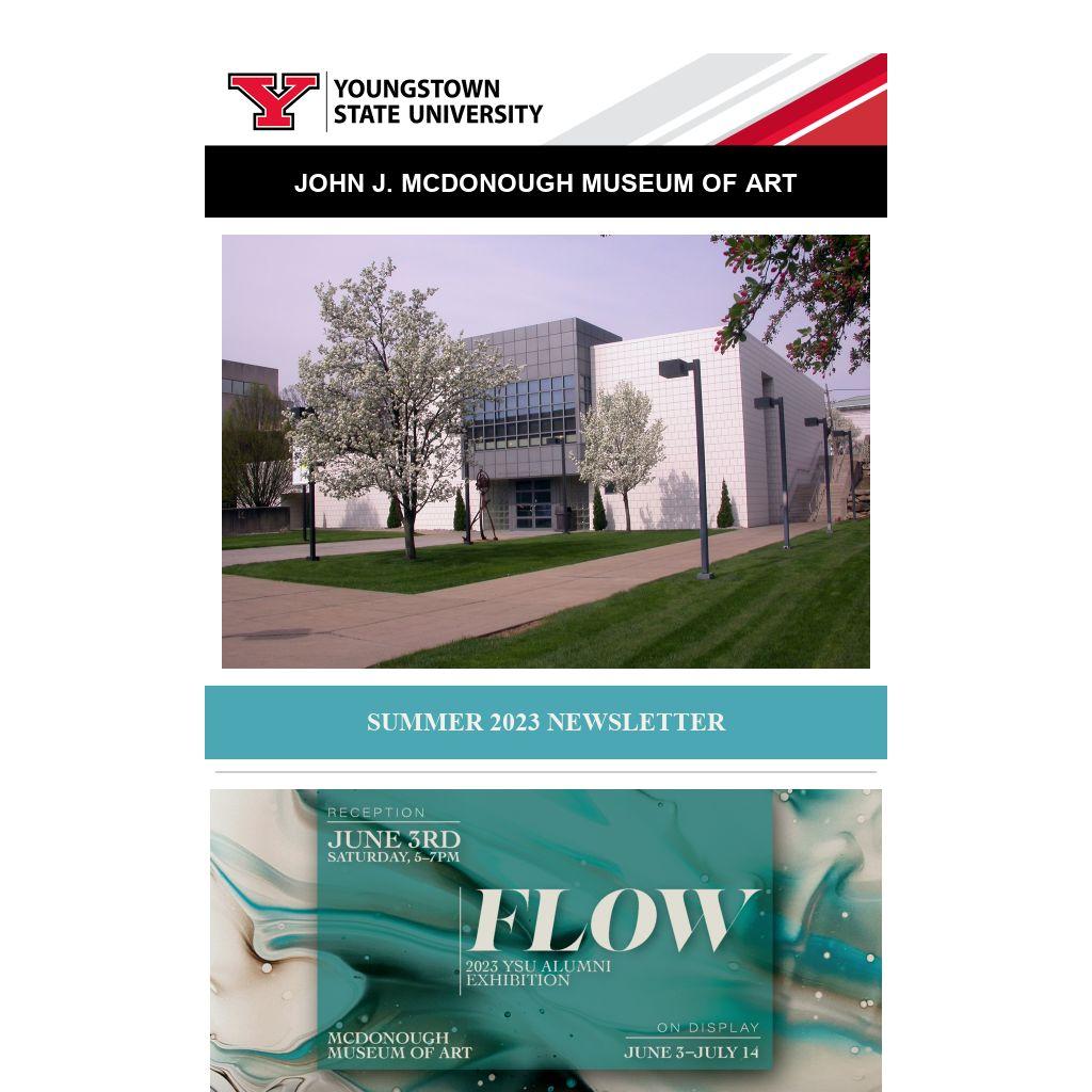 Flow the 2023 Alumni Exhibition honors Department of Art graduates and celebrates over seventy years of arts education in the Cliffe College of Creative Arts at Youngstown State University. This special reunion of alumni work reflects the diversity of the Department of Art and exemplifies the deeply-rooted and far-reaching creative spirit of YSU. The exhibition features art in a variety of media by alumni from across the country. Of the 100 plus works entered, 80 pieces by 69 alumni artists were accepted. Participating alumni include professional artists, art educators, and representatives from a broad range of fields who have benefited from the creative problem solving and critical thinking skills engendered by their studio art education.