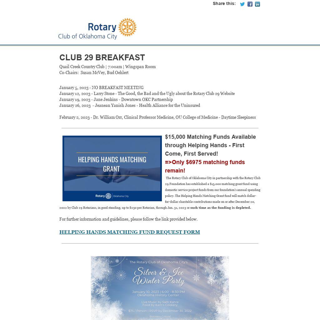 The Rotary Club of Oklahoma City in partnership with the Rotary Club 29 Foundation has established a $15,000 matching grant fund using domestic service project funds from our foundation's annual spending policy. The Helping Hands Matching Grant fund will match dollar-for-dollar charitable contributions made on or after December 20, 2022 by Club 29 Rotarians, in good standing, up to $250 per Rotarian, through Jan. 31, 2023 or such time as the funding is depleted.