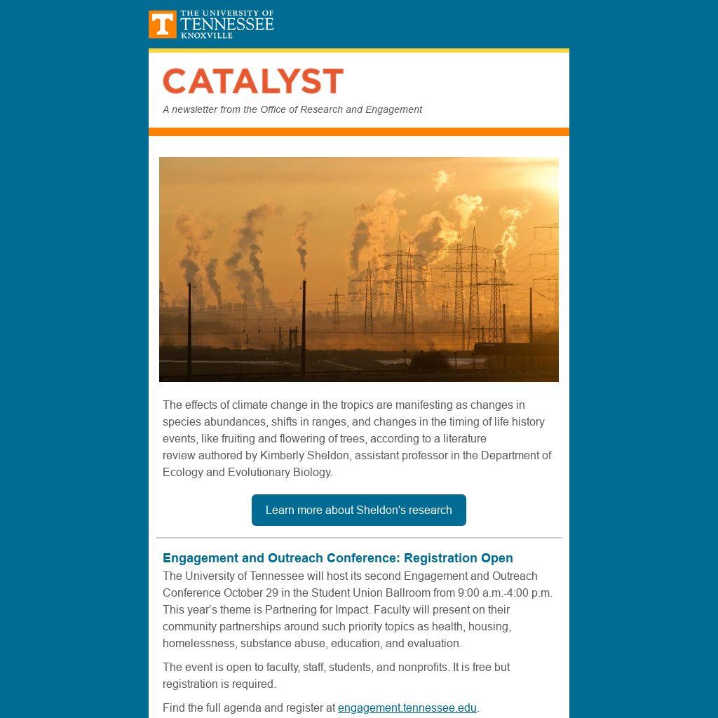 The University of Tennessee will host its second Engagement and Outreach Conference October 29 in the Student Union Ballroom from 9:00 a.m.-4:00 p.m. This year’s theme is Partnering for Impact. Faculty will present on their community partnerships around such priority topics as health, housing, homelessness, substance abuse, education, and evaluation.
