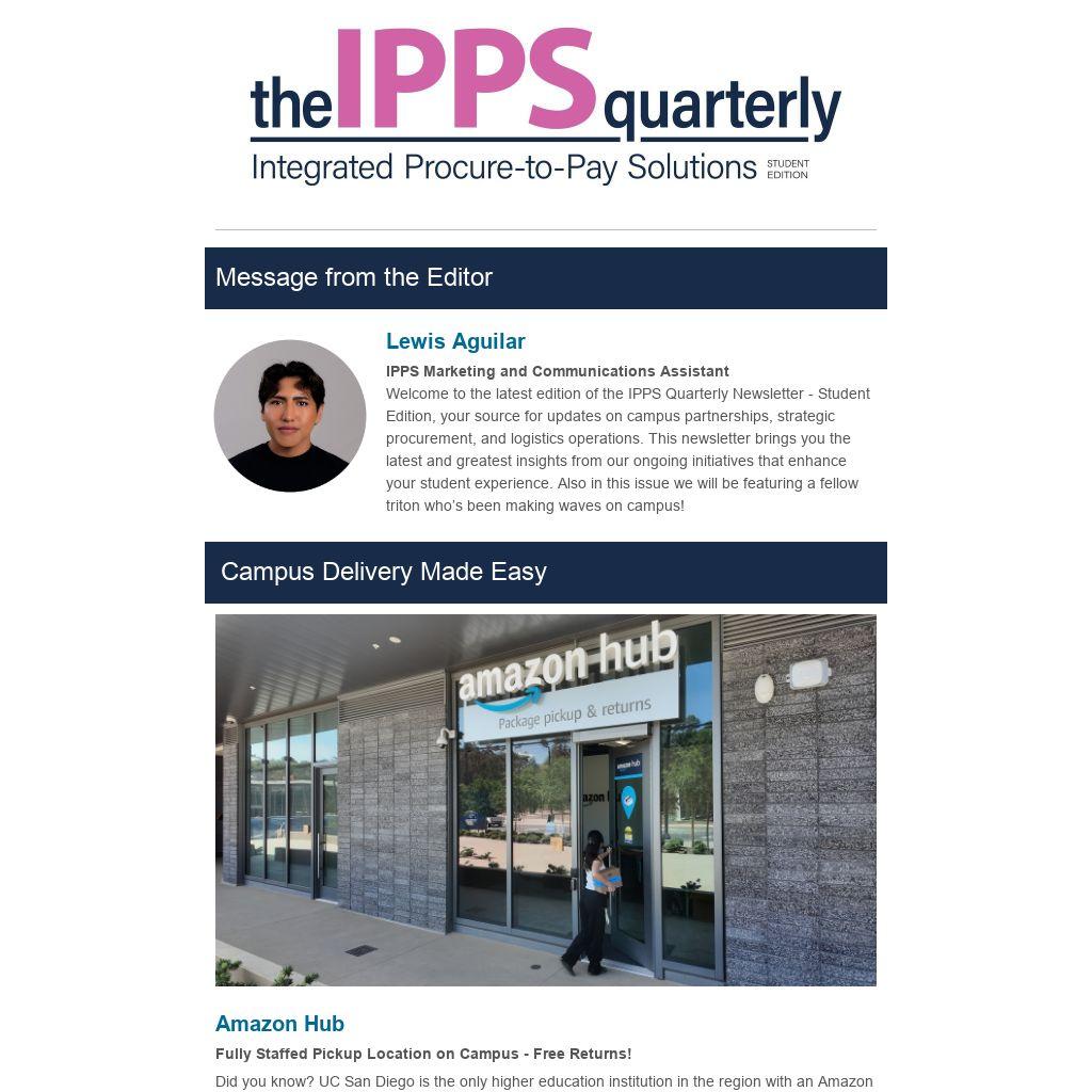 Welcome to the latest edition of the IPPS Quarterly Newsletter - Student Edition, your source for updates on campus partnerships, strategic procurement, and logistics operations. This newsletter brings you the latest and greatest insights from our ongoing initiatives that enhance your student experience. Also in this issue we will be featuring a fellow triton who’s been making waves on campus!Â