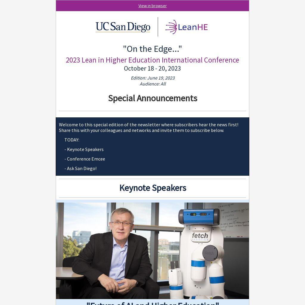 We are thrilled to announce another Keynote Speaker for the 2023 Lean HE Conference, Ms. Cathy O'Sullivan, from the University of California Office of the President (UCOP). Join us "On the Edge..." to hear about Ms.O'Sullivan's insights and vast experience in California public higher education.