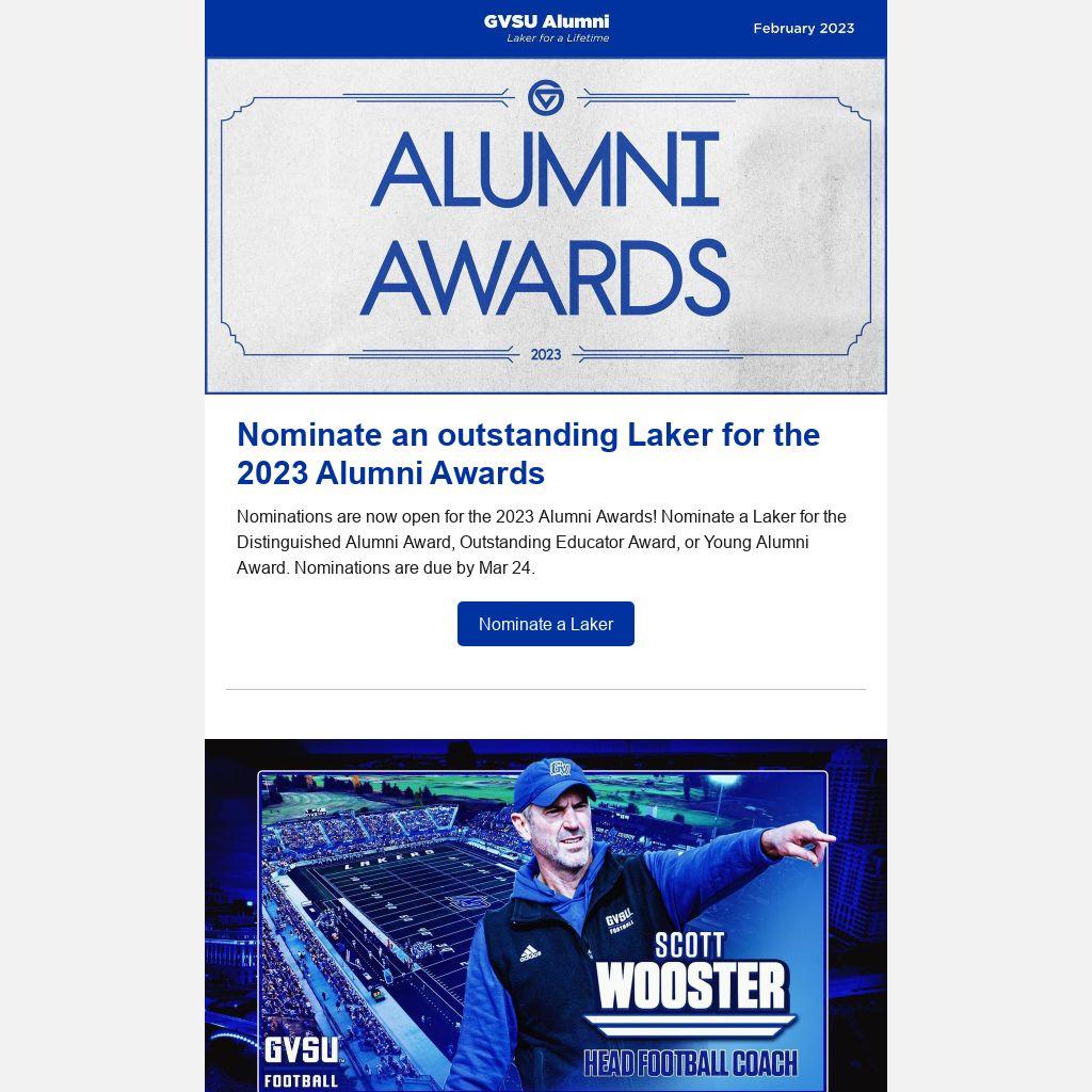 Nominations are now open for the 2023 Alumni Awards! Nominate a Laker for the Distinguished Alumni Award, Outstanding Educator Award, or Young Alumni Award. Nominations are due by Mar 24.