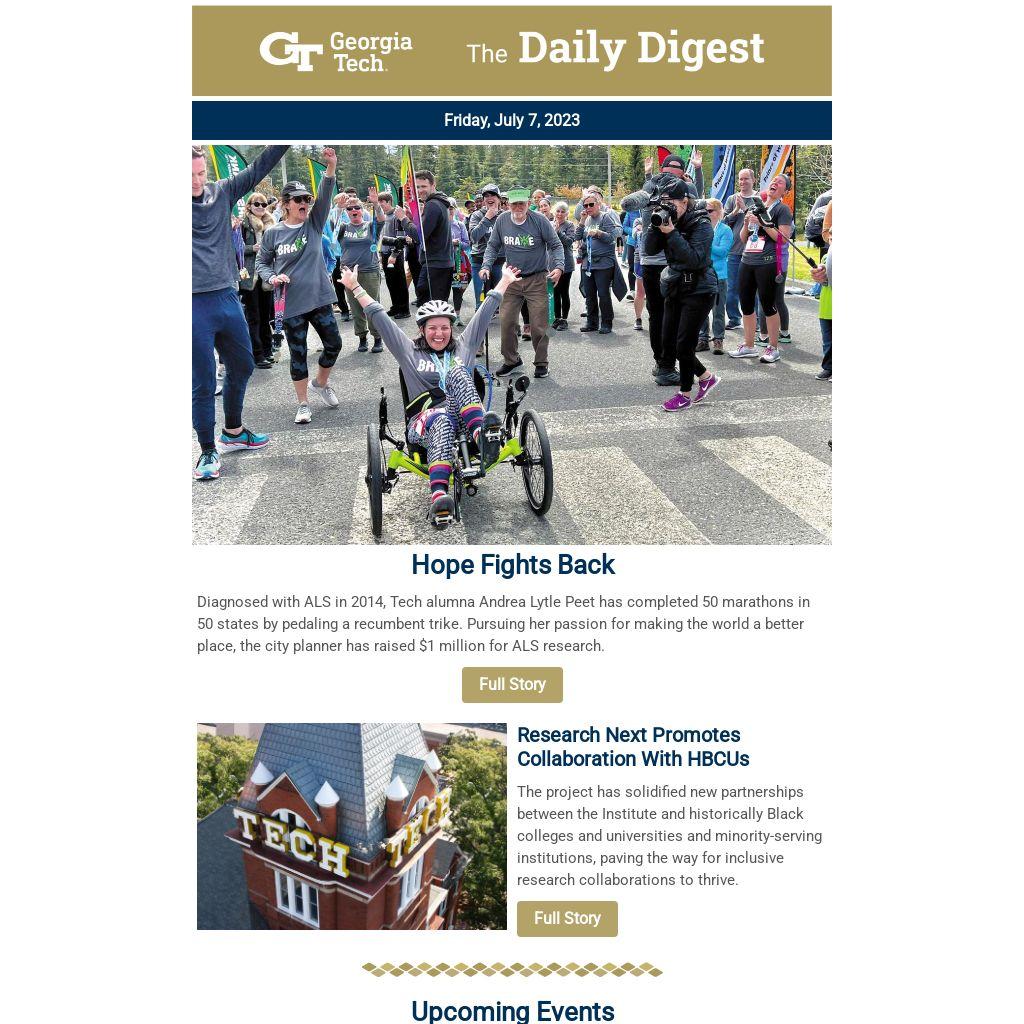 Diagnosed with ALS in 2014, Tech alumna Andrea Lytle Peet has completed 50 marathons in 50 states by pedaling a recumbent trike. Pursuing her passion for making the world a better place, the city planner has raised $1 million for ALS research.