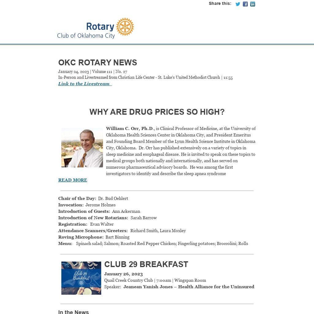 Rotary Club 29 has an online membership directory which contains current content information for all club members. The link to access the Club 29 directory can be found at the top of the home page of okcrotary.club or by clicking here. OKC Rotary has provided this tool as a convenience to help members stay in touch with one another. The online directory, just like the printed roster, should only be used for Rotary purposes. If you need help in accessing the directory, please email the office.