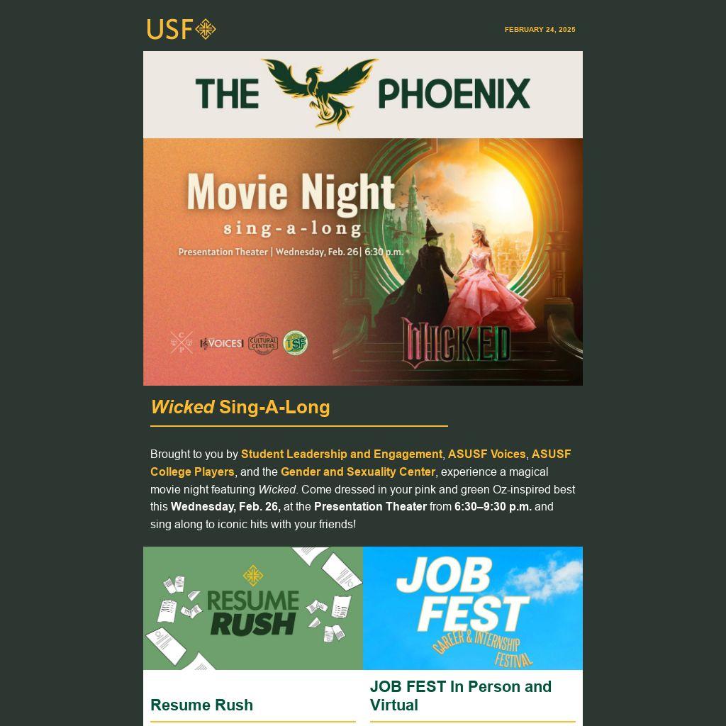 The Phoenix is a weekly e-newsletter sent by Student Leadership and Engagement to help students stay connected and get involved. It features campus events, leadership opportunities, athletic games, workshops, retreats, and more. Why “The Phoenix” title? The Phoenix has long been associated with the history and growth of USF as well as St. Ignatius, who encouraged followers to “go forth and set the world on fire.” Learn more »