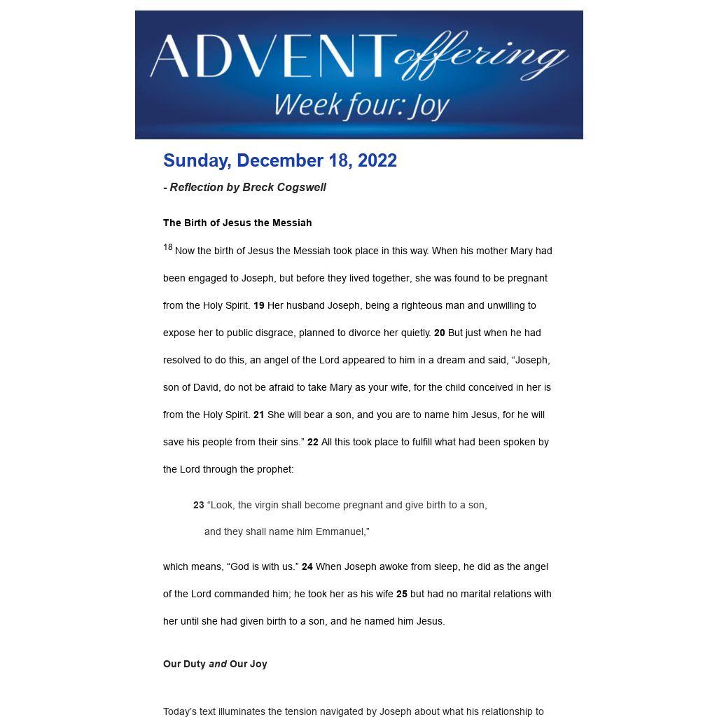 So, what of Mary? She is also put in this difficult social place, likely even more than Joseph. Assuming she is aware of Joseph’s debate about staying or leaving, she also deserves some serious credit for how they could have been navigating this relationship-altering decision. Are they having conversations about this? Is Joseph falling into the trap of allowing shame to stop him from fulfilling his piece of this story? What are Joseph’s feelings about taking on a parenting role with this coming child?