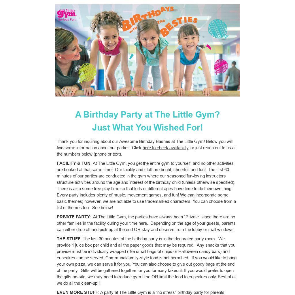 Thank you for inquiring about our Awesome Birthday Bashes at The Little Gym! Below you will find some information about our parties. Click here to check availability, or just reach out to us at the numbers below (phone or text).