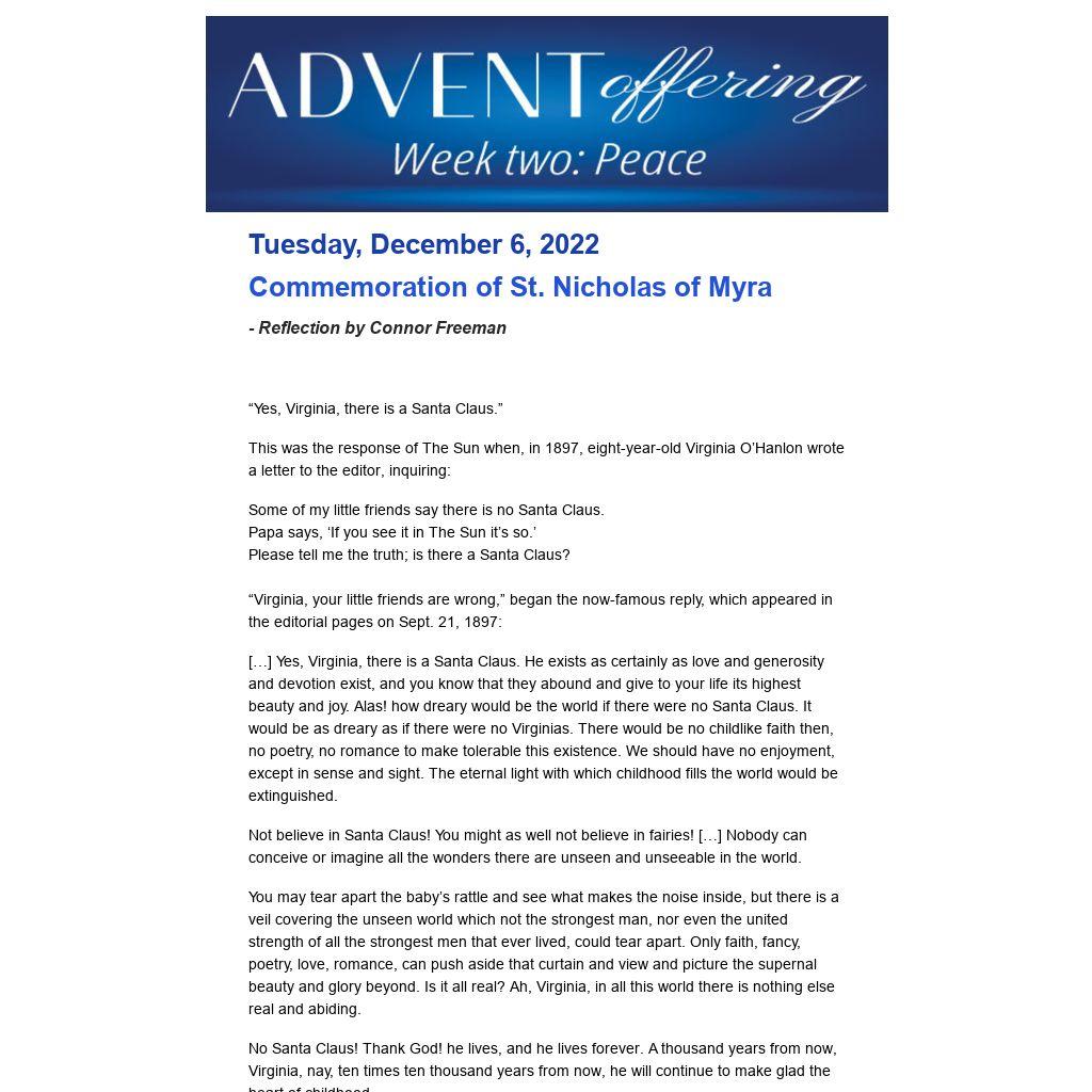 Above all, there is a promise affixed to this time of year. It is a promise that Nicholas knew well: a promise of peace, comfort, joy, and holy mystery. It is coming soon! and it is very real, indeed.
