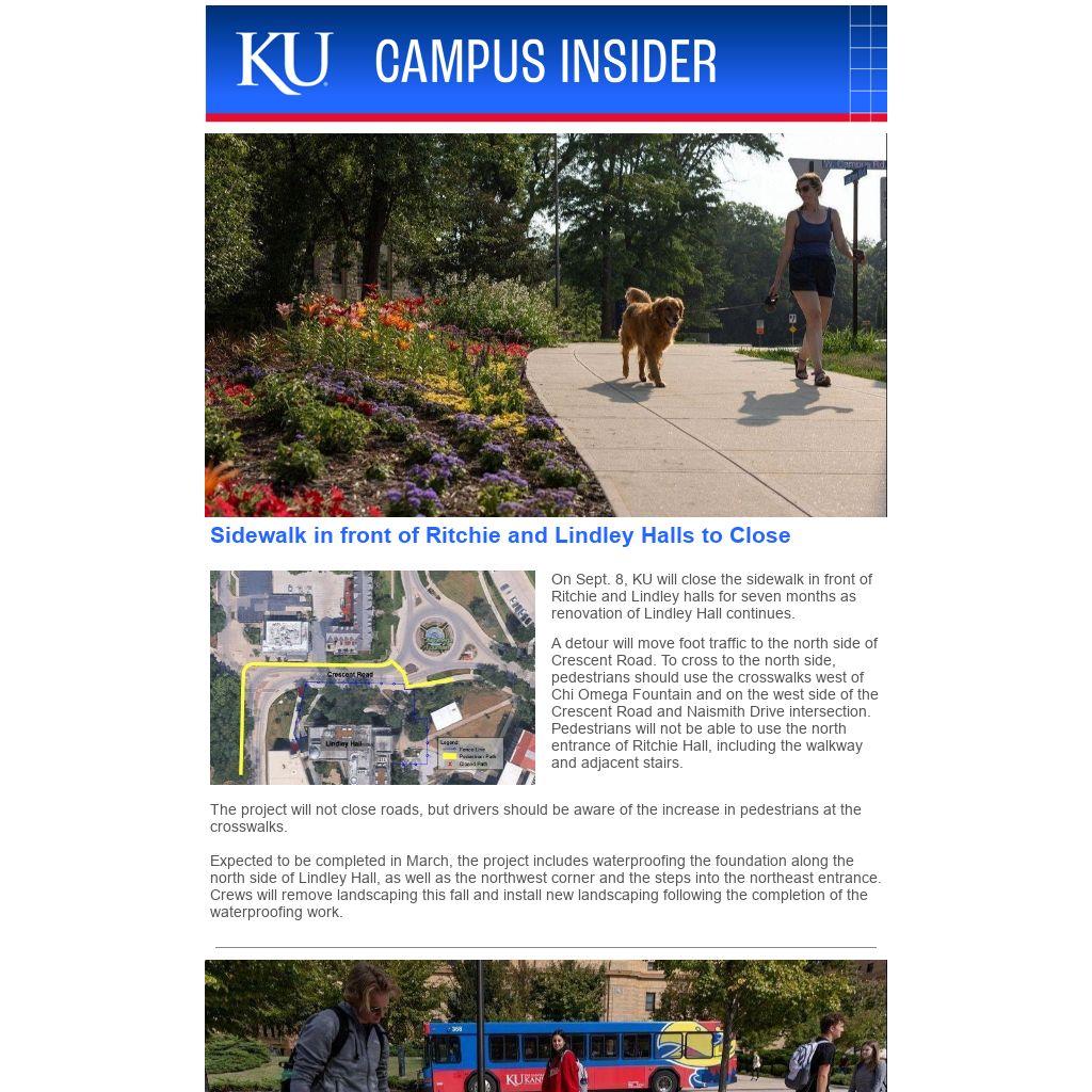 | On Sept. 8, KU will close the sidewalk in front of Ritchie and Lindley halls for seven months as renovation of Lindley Hall continues.