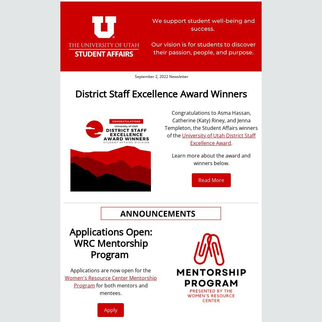 The Union Programming Council and the Bennion Center are hosting a Volunteer Connection Fair in the Union Ballroom on September 8, 2022, from 11 a.m. to 2 p.m. Staff are also invited to come and learn more about volunteer opportunities available in the community.