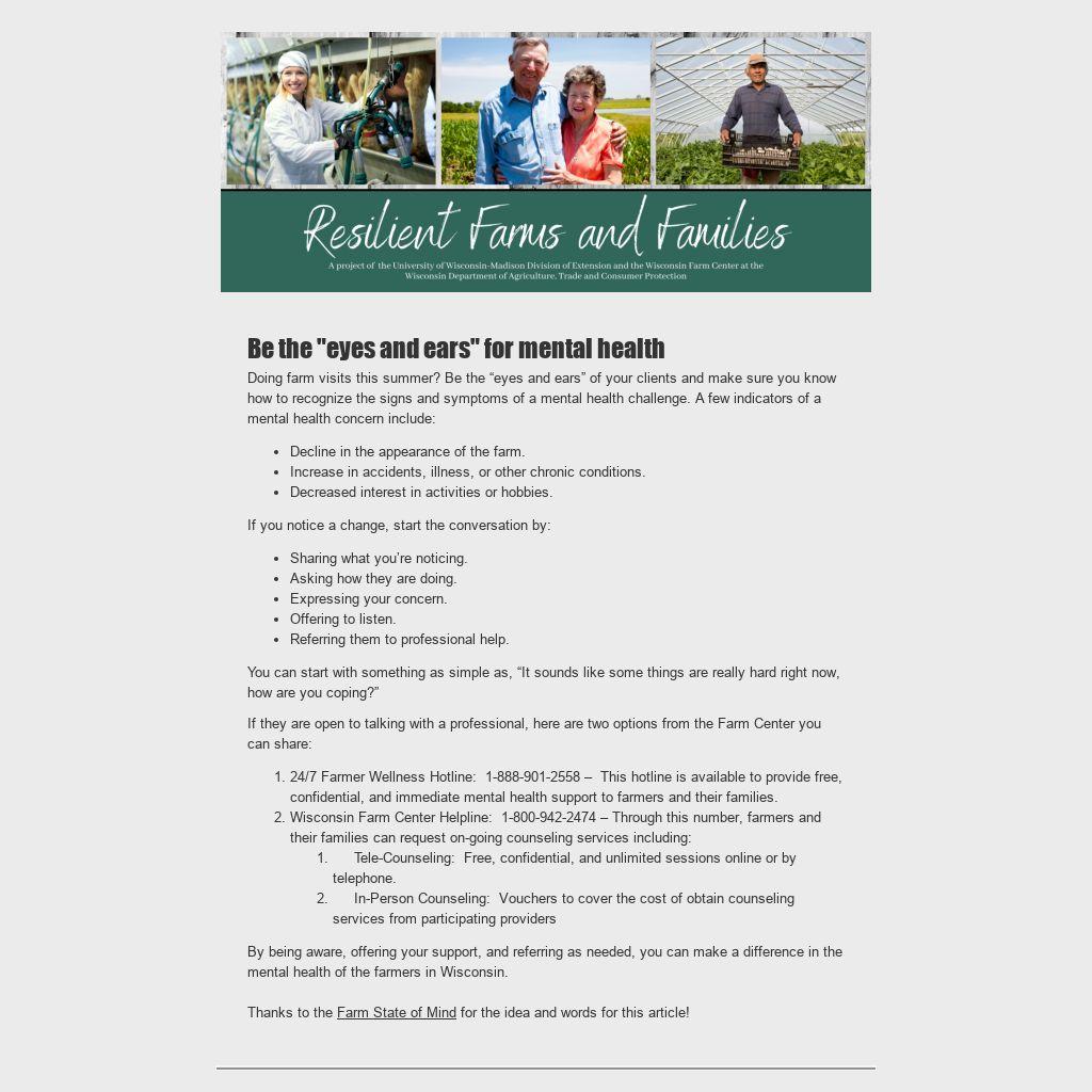 By being aware, offering your support, and referring as needed, you can make a difference in the mental health of the farmers in Wisconsin.