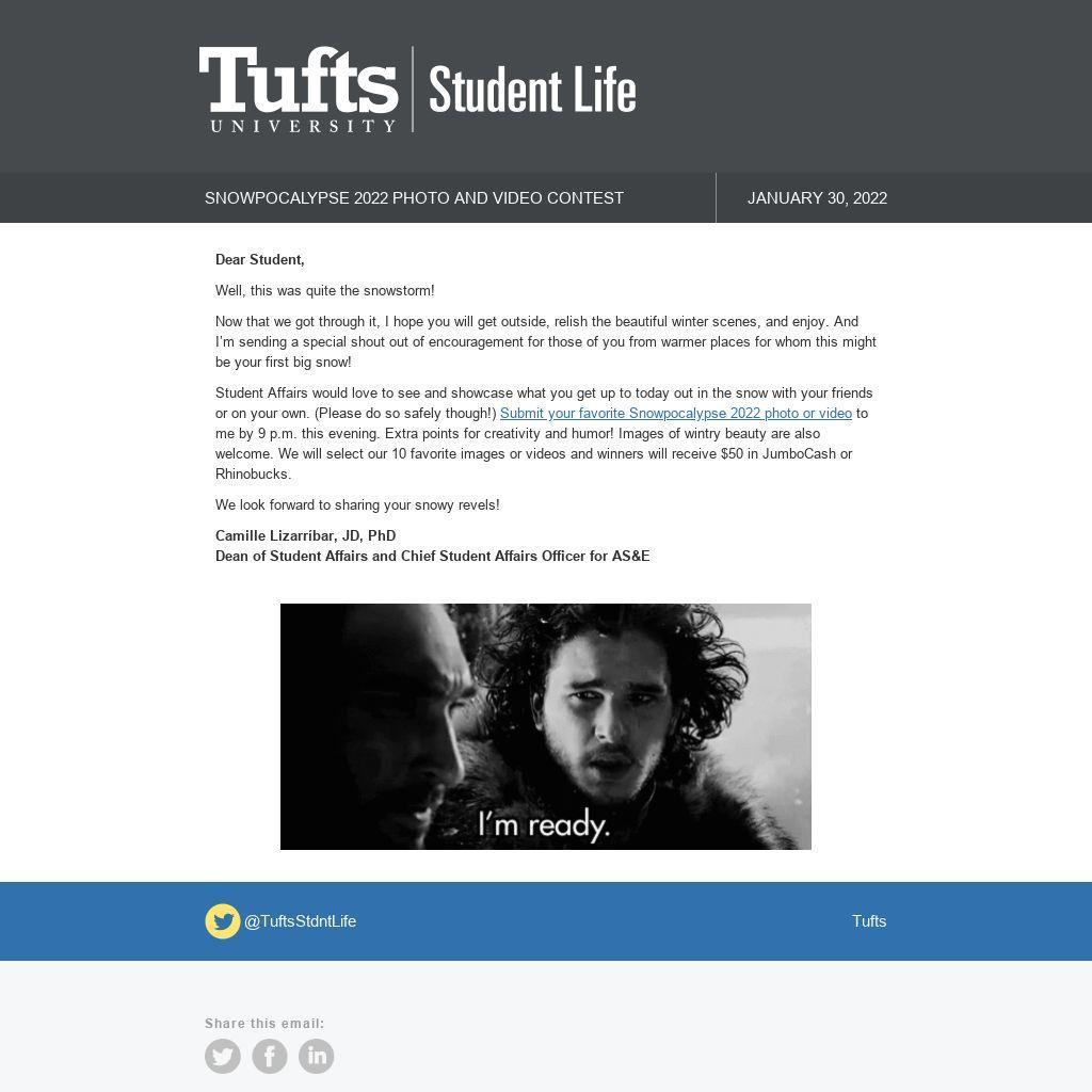 Student Affairs would love to see and showcase what you get up to today out in the snow with your friends or on your own. (Please do so safely though!) Submit your favorite Snowpocalypse 2022 photo or video to me by 9 p.m. this evening. Extra points for creativity and humor! Images of wintry beauty are also welcome. We will select our 10 favorite images or videos and winners will receive $50 in JumboCash or Rhinobucks.
