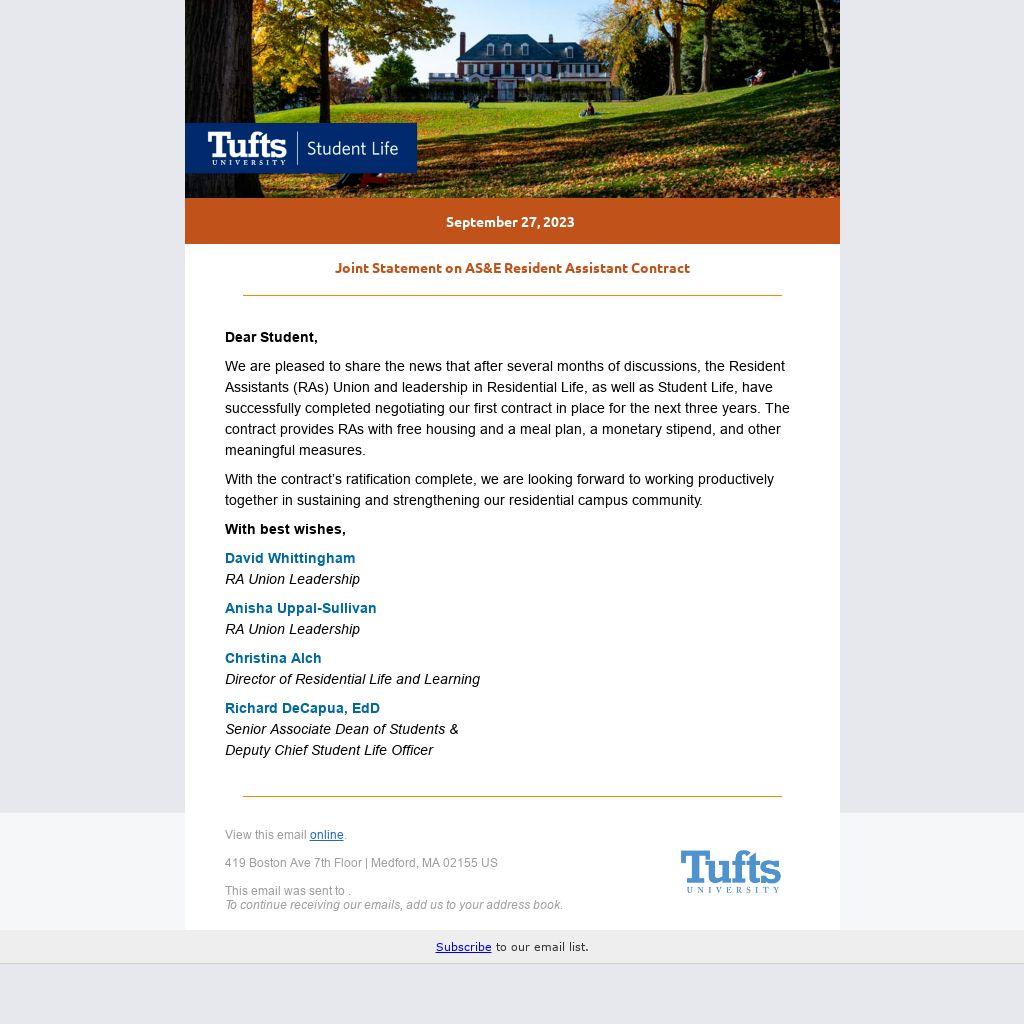 We are pleased to share the news that after several months of discussions, the Resident Assistants (RAs) Union and leadership in Residential Life, as well as Student Life, have successfully completed negotiating our first contract in place for the next three years. The contract provides RAs with free housing and a meal plan, a monetary stipend, and other meaningful measures.