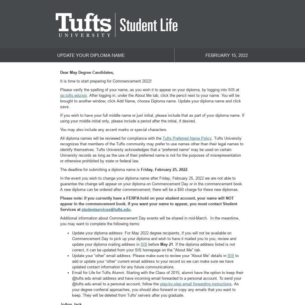 Please verify the spelling of your name, as you wish it to appear on your diploma, by logging into SIS at go.tufts.edu/sis. After logging in, under the About Me tab, click the pencil next to your name. You will be brought to another window; click Add Name, choose Diploma name. Update your diploma name and click save.