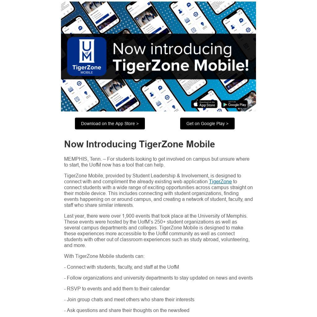 The UofM community can find more information about getting involved on campus by visiting Student Leadership and Involvement in the University Center office 211. Feedback on TigerZone Mobile is welcomed and can be sent to studentinvolvement@memphis.edu