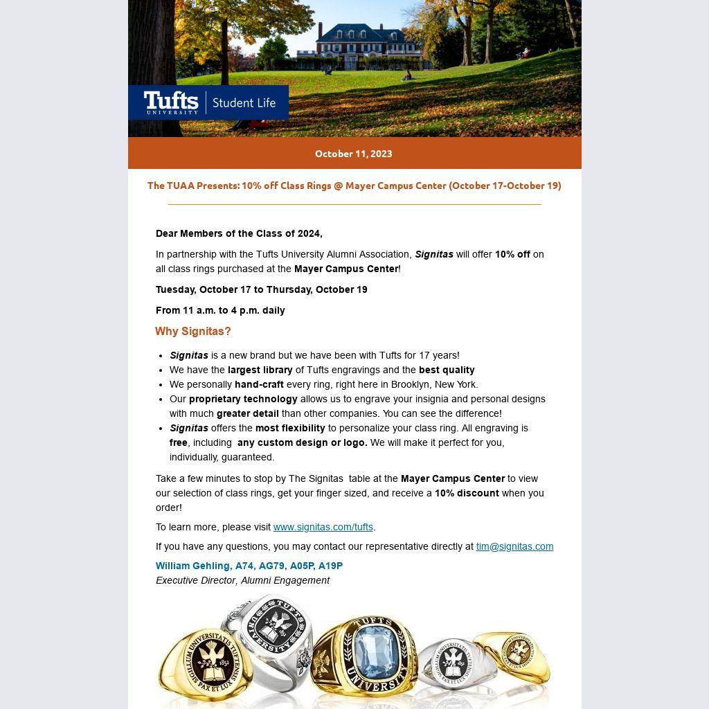 In partnership with the Tufts University Alumni Association, Signitas will offer 10% off on all class rings purchased at the Mayer Campus Center!