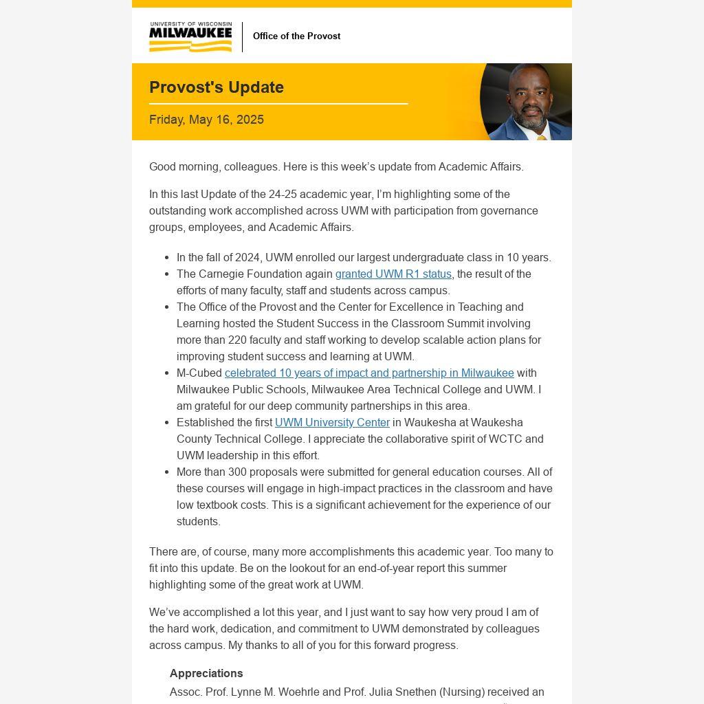 In this last Update of the 24-25 academic year, I’m highlighting some of the outstanding work accomplished across UWM with participation from governance groups, employees, and Academic Affairs.