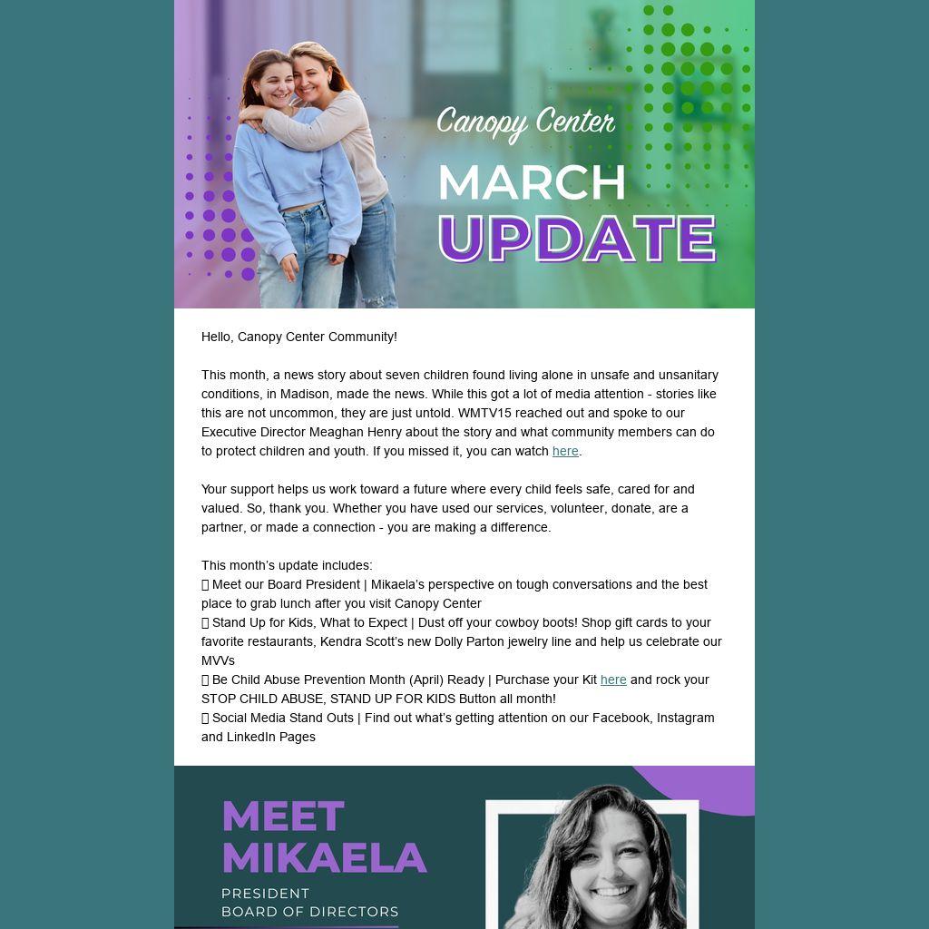 Canopy Center provides essential support to our community, but child abuse and neglect is an uncomfortable subject - one that requires us to acknowledge it is happening and one that many shy away from discussing. I’m not afraid to have these conversations and to help raise awareness about topics that may be considered taboo. That passion is what first drew me in what continues to motivate me, today. It’s important that there be open dialogue and that people know that resources like Canopy Center exist! Not every community has this privilege, and it’s important to me that ours knows we are here!