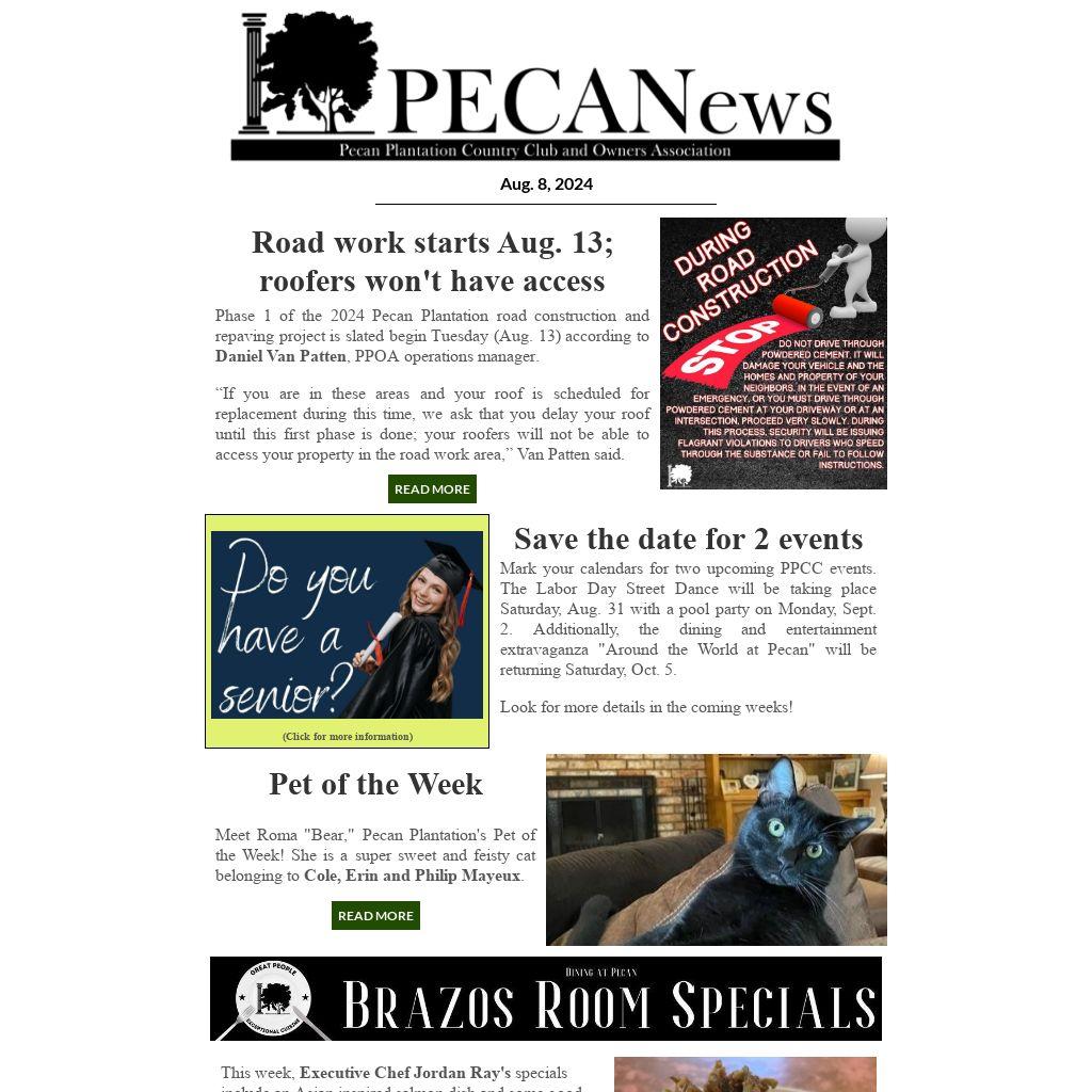 Phase 1 of the 2024 Pecan Plantation road construction and repaving project is slated begin Tuesday (Aug. 13) according to Daniel Van Patten, PPOA operations manager.