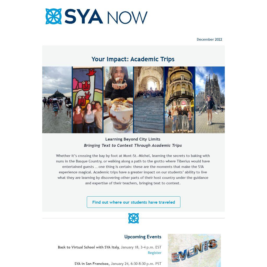 School Year Abroad (SYA) is committed to promoting intercultural understanding and appreciation through the immersive adventure of fully engaging with different languages and peoples. SYA guides its students through a challenging curriculum focused on developing skills and cultural competencies for an increasingly interdependent world.