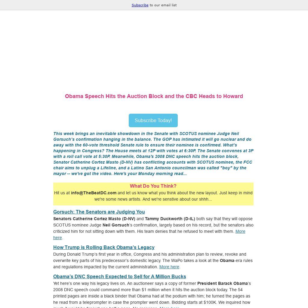 THE BEAT's sheet publishes Monday through Friday and is viewed by members of Congress, Capitol Hill staff, administration officials, government relations professionals, media, stakeholders, and influencers, and those who have an interest in the intersection of people of color and Beltway politics. Reach the diverse audience that drives the nation's capital. Email us at info@TheBeatDC.com for more information.