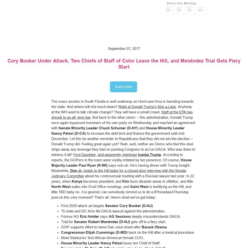The mass exodus in South Florida is well underway as Hurricane Irma is barreling towards the state. And where will she touch down? Right at Donald Trump’s Mar-a-Lago. Anybody at the WH want to talk climate change? They will have a small crowd. Staff at the EPA has shrunk to an all- time low. But back to the other storm -- this administration. Donald Trump once again bypassed members of his own party on Wednesday and reached an agreement with Senate Minority Leader Chuck Schumer (D-NY) and House Minority Leader Nancy Pelosi (D-CA) to increase the debt limit and finance the government until mid-December. Let this be another reminder to Republicans that they did not win the election -- Donald Trump did. Feeling great again yet? Yeah, well, neither are Dems who feel this deal strips away any leverage they had on pushing Congress to act on DACA. Who was there to witness it all? First Daughter, and apparently, interloper Ivanka Trump. According to reports, the GOPers in the room were visibly irritated by her presence. Of course, House Majority Leader Paul Ryan (R-WI) says nuh-uh. He’s having dinner with Trump tonight. Meanwhile, Don Jr. heads to the Hill today for a closed-door interview with the Senate Judiciary Committee about his controversial meeting with a Russian lawyer last year. In 22 years, when Kanye becomes president, and Kim tours disaster areas in stilettos, and little North West walks into Oval Office meetings, and Saint West is testifying on the Hill, and little TBD baby no. 3 is ignored, can somebody remind us to do a #ThrowbackThursday post on this very moment? That’s all. Here’s what we’ve got today: