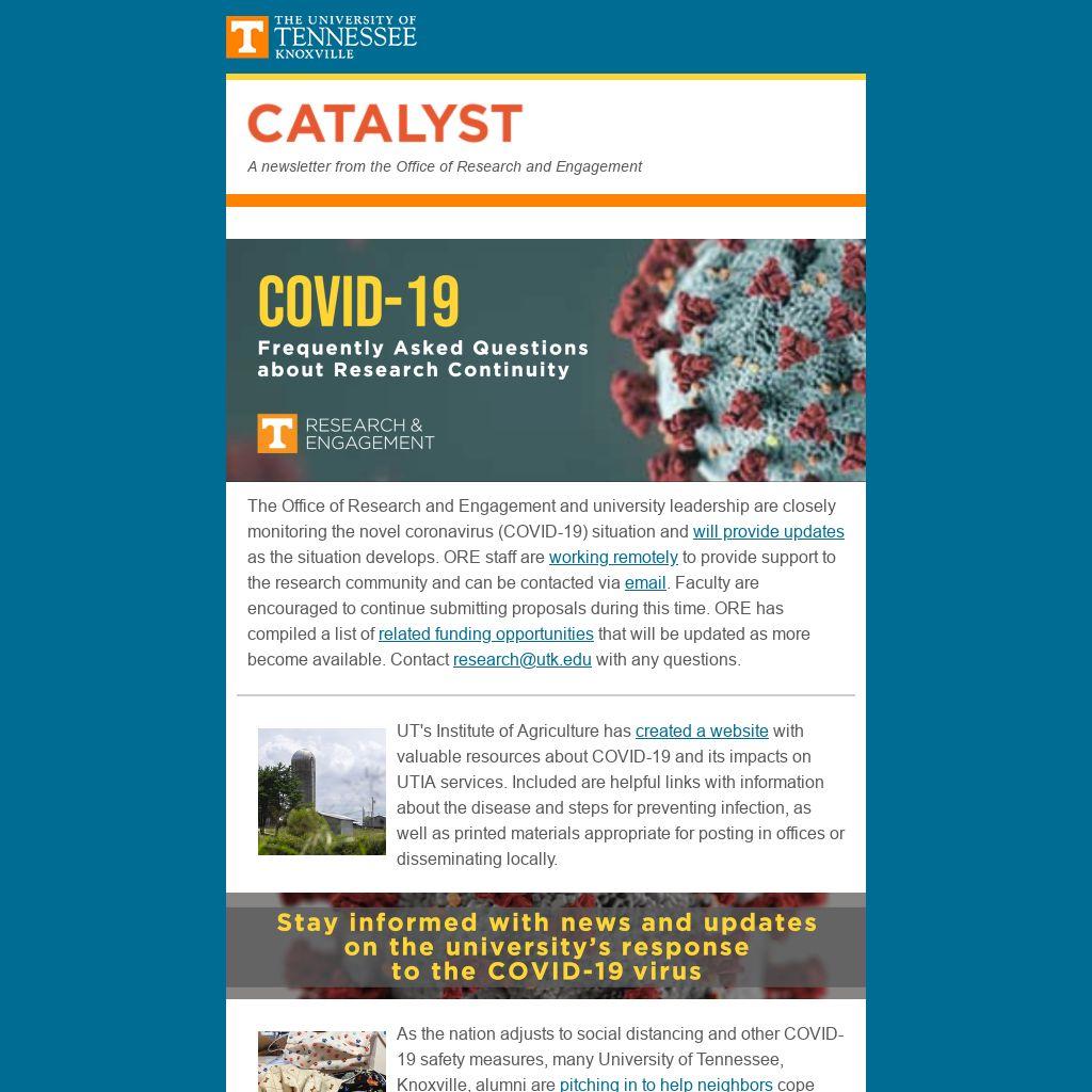 The Office of Research and Engagement and university leadership are closely monitoring the novel coronavirus (COVID-19) situation and will provide updates as the situation develops. ORE staff are working remotely to provide support to the research community and can be contacted via email. Faculty are encouraged to continue submitting proposals during this time. ORE has compiled a list of related funding opportunities that will be updated as more become available. Contact research@utk.edu with any questions.
