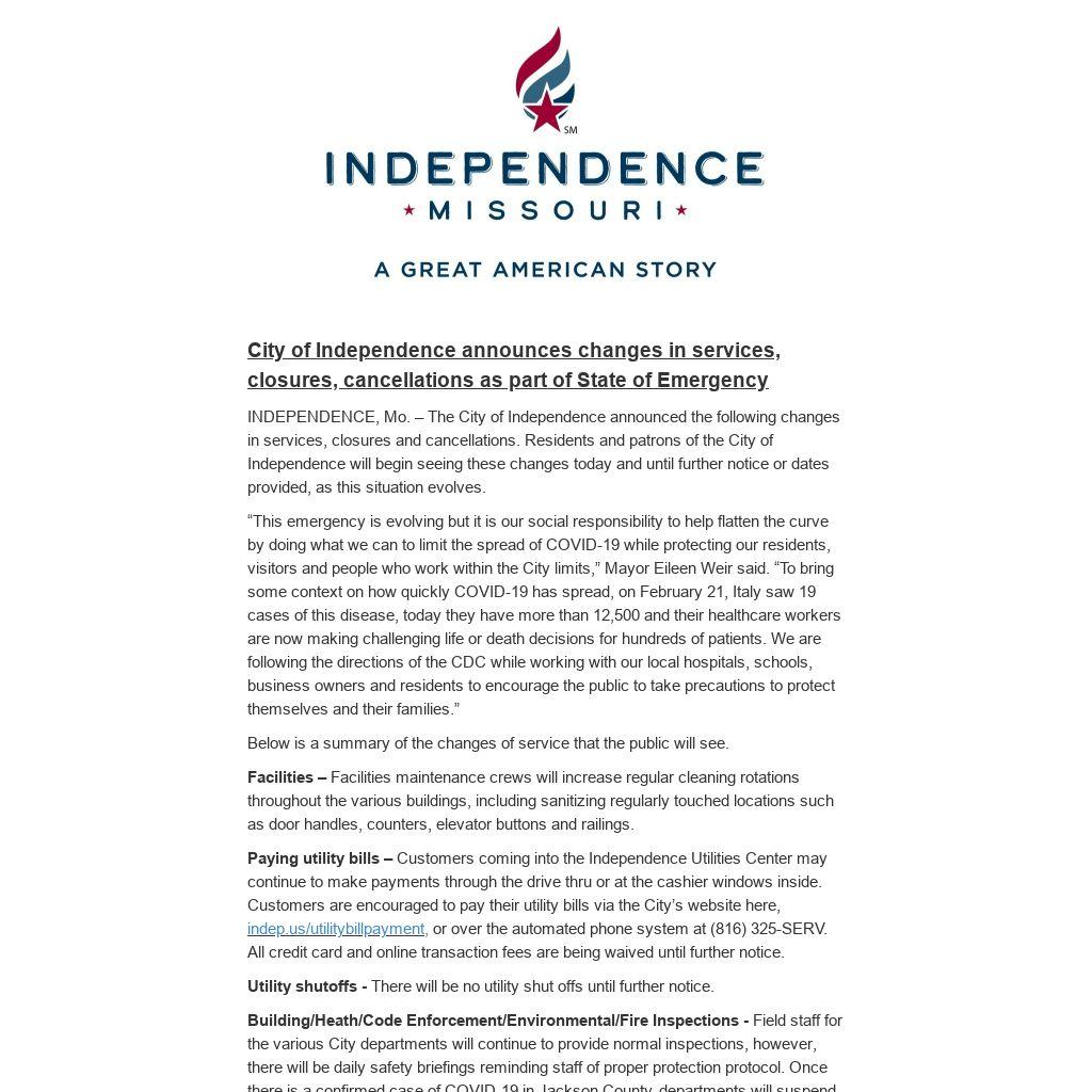 City of Independence announces changes in services, closures, cancellations as part of State of Emergency