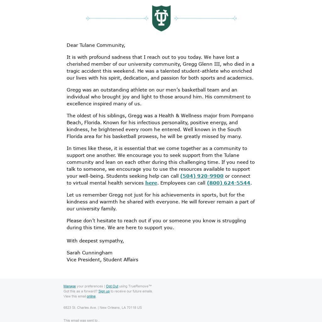 It is with profound sadness that I reach out to you today. We have lost a cherished member of our university community, Gregg Glenn III, who died in a tragic accident this weekend. He was a talented student-athlete who enriched our lives with his spirit, dedication, and passion for both sports and academics.
