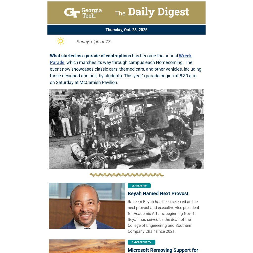 What started as a parade of contraptions has become the annual Wreck Parade, which marches its way through campus each Homecoming. The event now showcases classic cars, themed cars, and other vehicles, including those designed and built by students. This year's parade begins at 8:30 a.m. on Saturday at McCamish Pavilion.