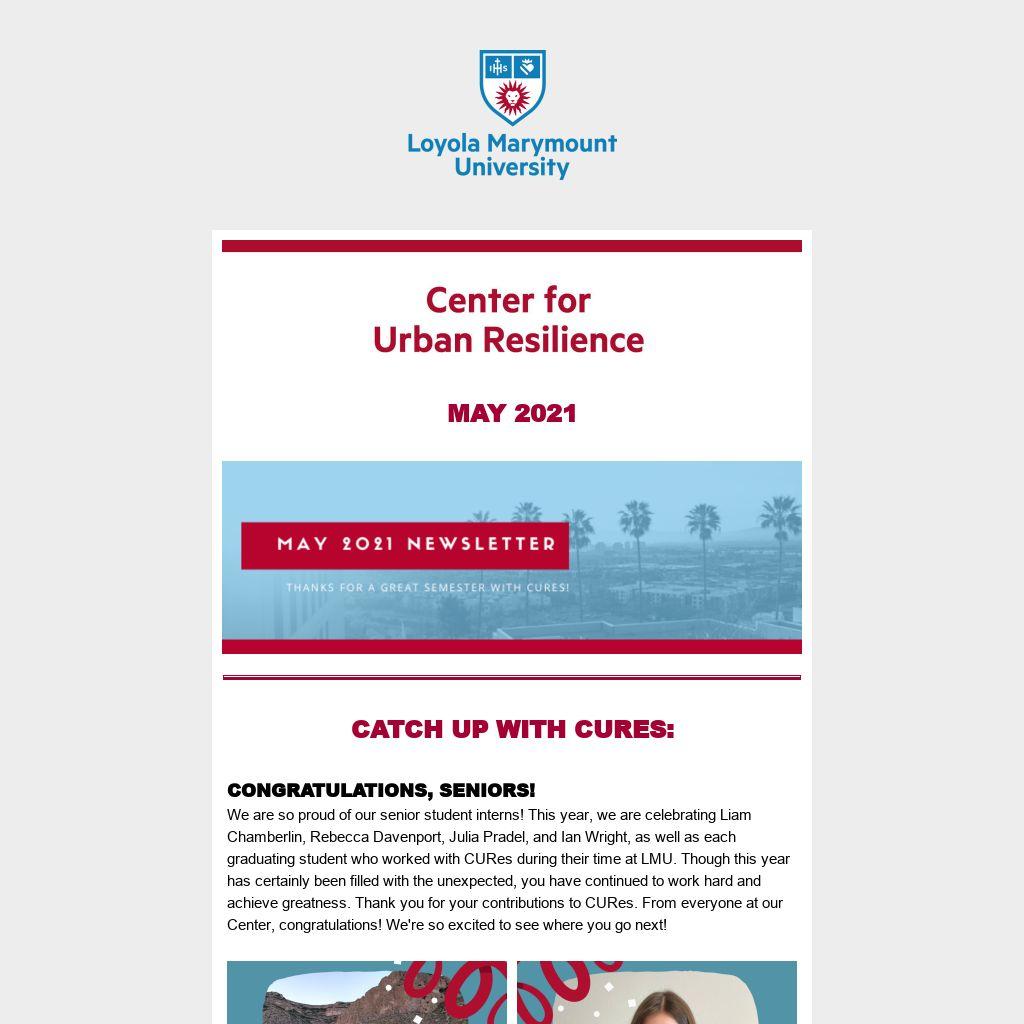 We are so proud of our senior student interns! This year, we are celebrating Liam Chamberlin, Rebecca Davenport, Julia Pradel, and Ian Wright, as well as each graduating student who worked with CURes during their time at LMU. Though this year has certainly been filled with the unexpected, you have continued to work hard and achieve greatness. Thank you for your contributions to CURes. From everyone at our Center, congratulations! We're so excited to see where you go next!