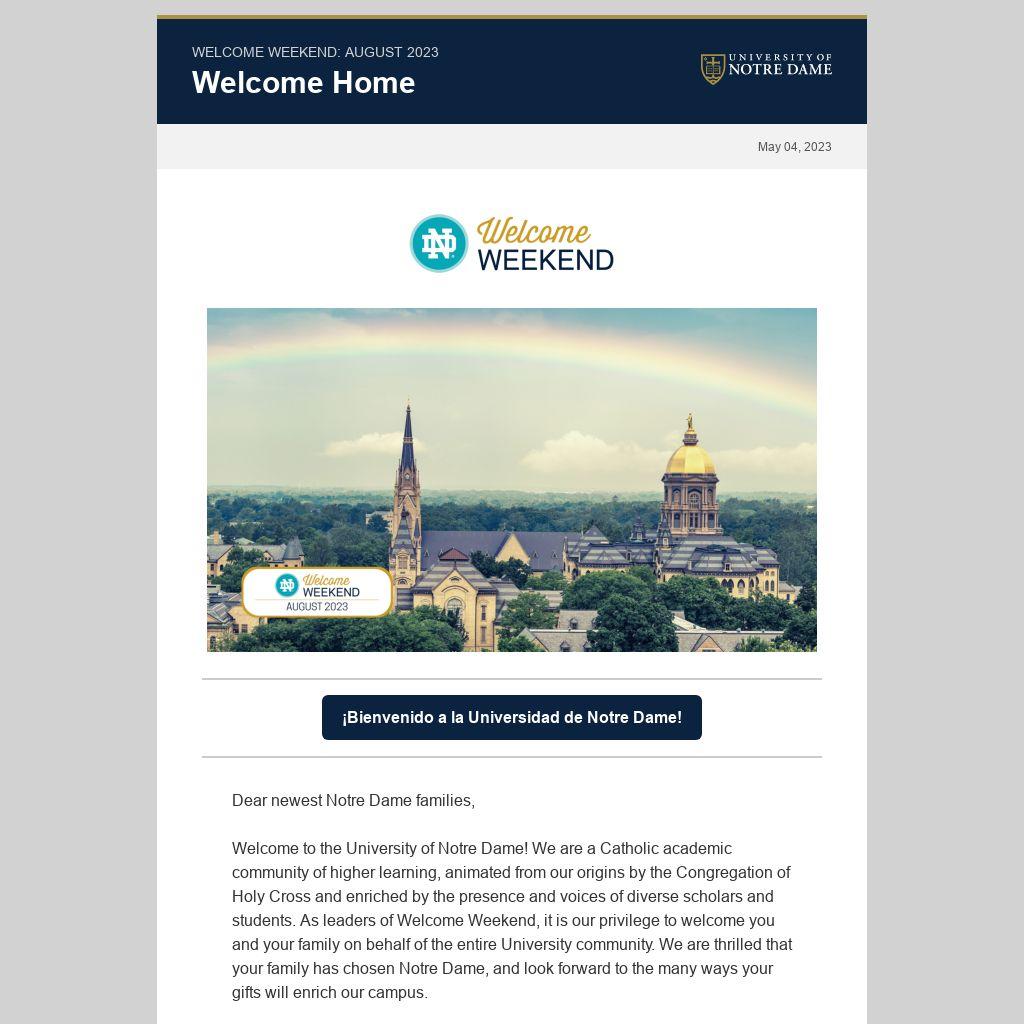 The Welcome Weekend planning team and our partners will be in touch with students via their Notre Dame Gmail account to offer updates, recommendations, residence hall assignments, and opportunities for engagement with the Notre Dame community. Students are encouraged to share all information with their families so that you might walk through this time of transition together. Since communications will be sent to students' Notre Dame Gmail account, it is important that all students activate their NetID, access their new email account, and check their inbox daily. Important communications can also be viewed on the Welcome Weekend website.