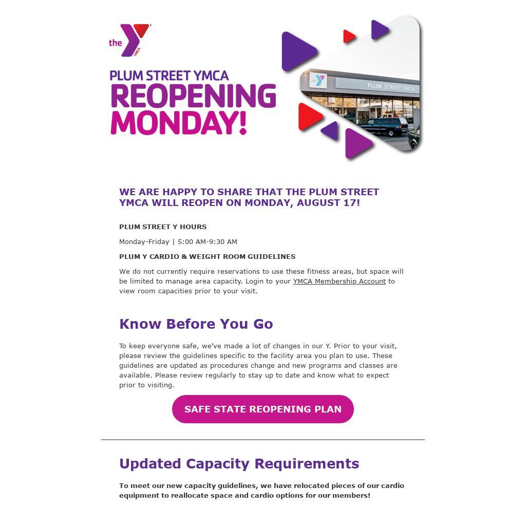 WE ARE HAPPY TO SHARE THAT THE PLUM STREET YMCA WILL REOPEN ON MONDAY, AUGUST 17!