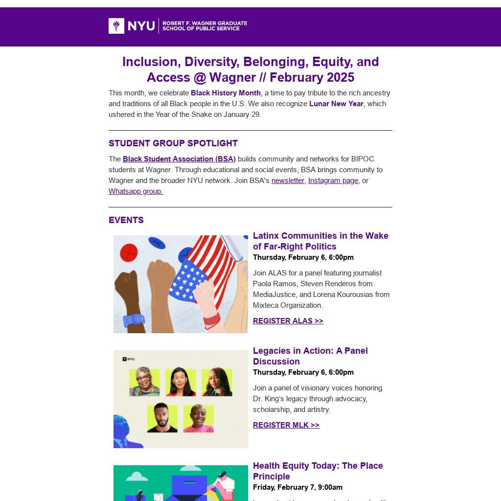 We're always eager to hear from you—whether it's suggestions for this newsletter, inspiring efforts to foster inclusion, or any questions about IDBEA at Wagner. Reach out to us at wagner.activities@nyu.edu.