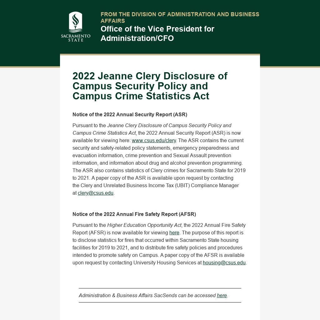 Jeanne Clery Disclosure of Campus Security Policy and Campus Crime Statistics Act, the 2022 Annual Security Report (ASR) is now available for viewing here: