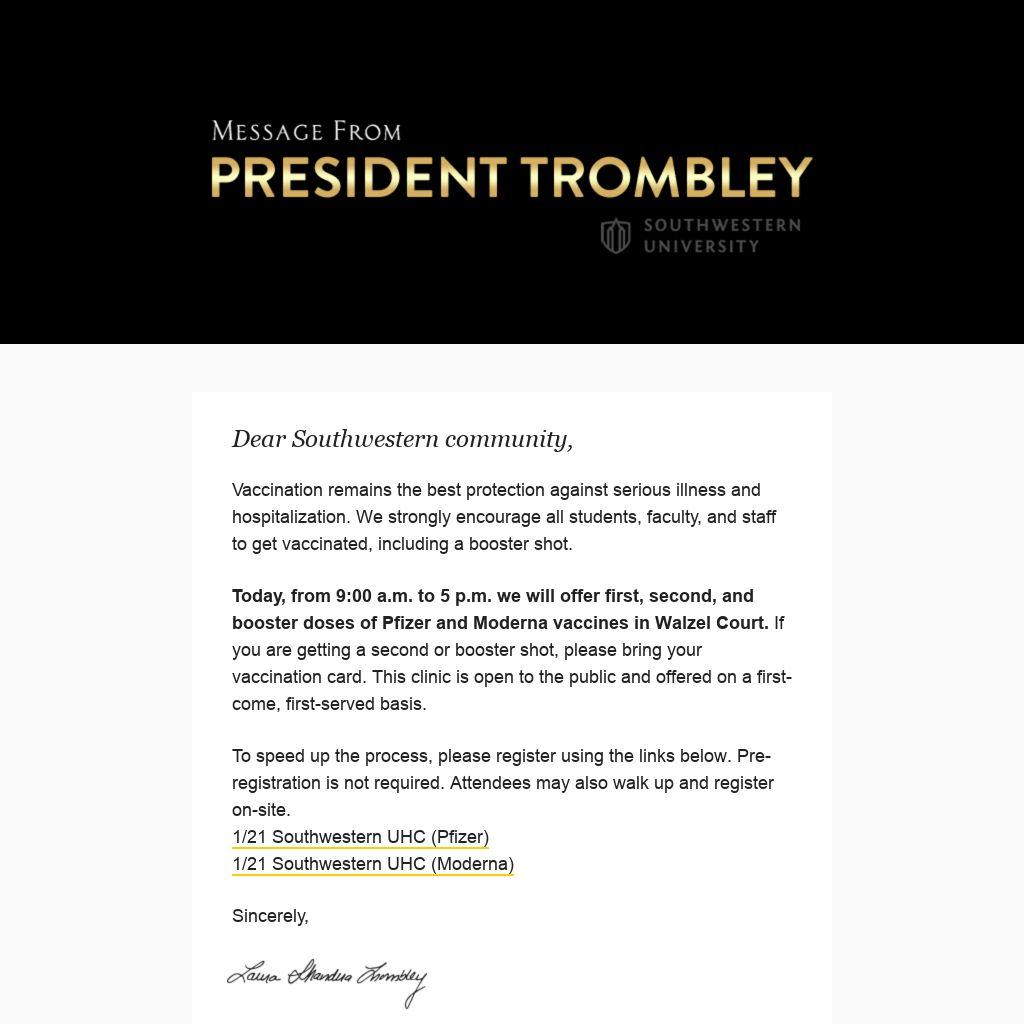 Today, from 9:00 a.m. to 5 p.m. we will offer first, second, and booster doses of Pfizer and Moderna vaccines in Walzel Court. If you are getting a second or booster shot, please bring your vaccination card. This clinic is open to the public and offered on a first-come, first-served basis.
