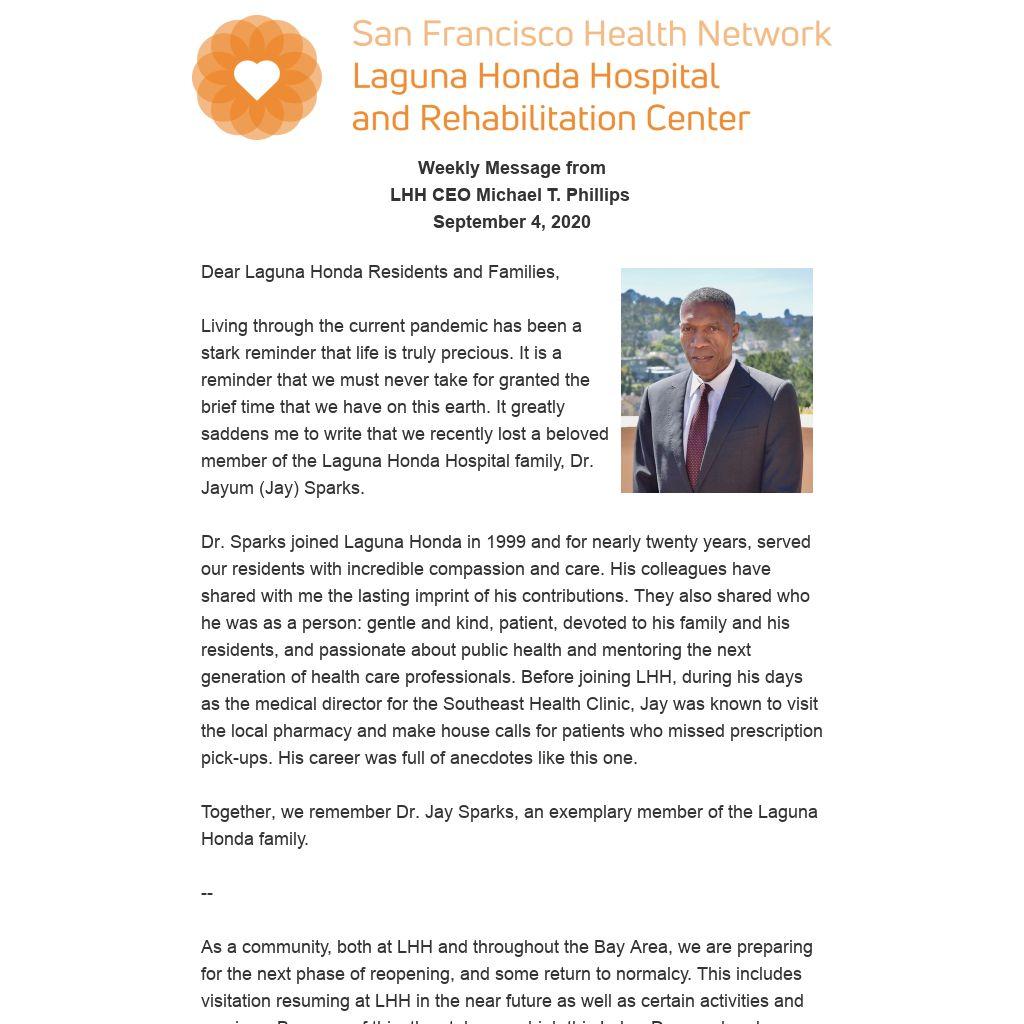 Dr. Sparks joined Laguna Honda in 1999 and for nearly twenty years, served our residents with incredible compassion and care. His colleagues have shared with me the lasting imprint of his contributions. They also shared who he was as a person: gentle and kind, patient, devoted to his family and his residents, and passionate about public health and mentoring the next generation of health care professionals. Before joining LHH, during his days as the medical director for the Southeast Health Clinic, Jay was known to visit the local pharmacy and make house calls for patients who missed prescription pick-ups. His career was full of anecdotes like this one.