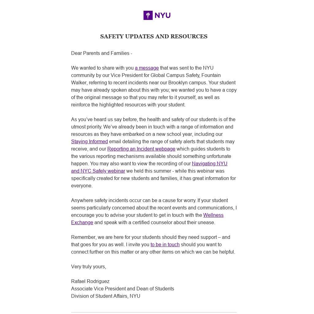 a message that was sent to the NYU community by our Vice President for Global Campus Safety, Fountain Walker, referring to recent incidents near our Brooklyn campus. Your student may have already spoken about this with you; we wanted you to have a copy of the original message so that you may refer to it yourself, as well as reinforce the highlighted resources with your student.