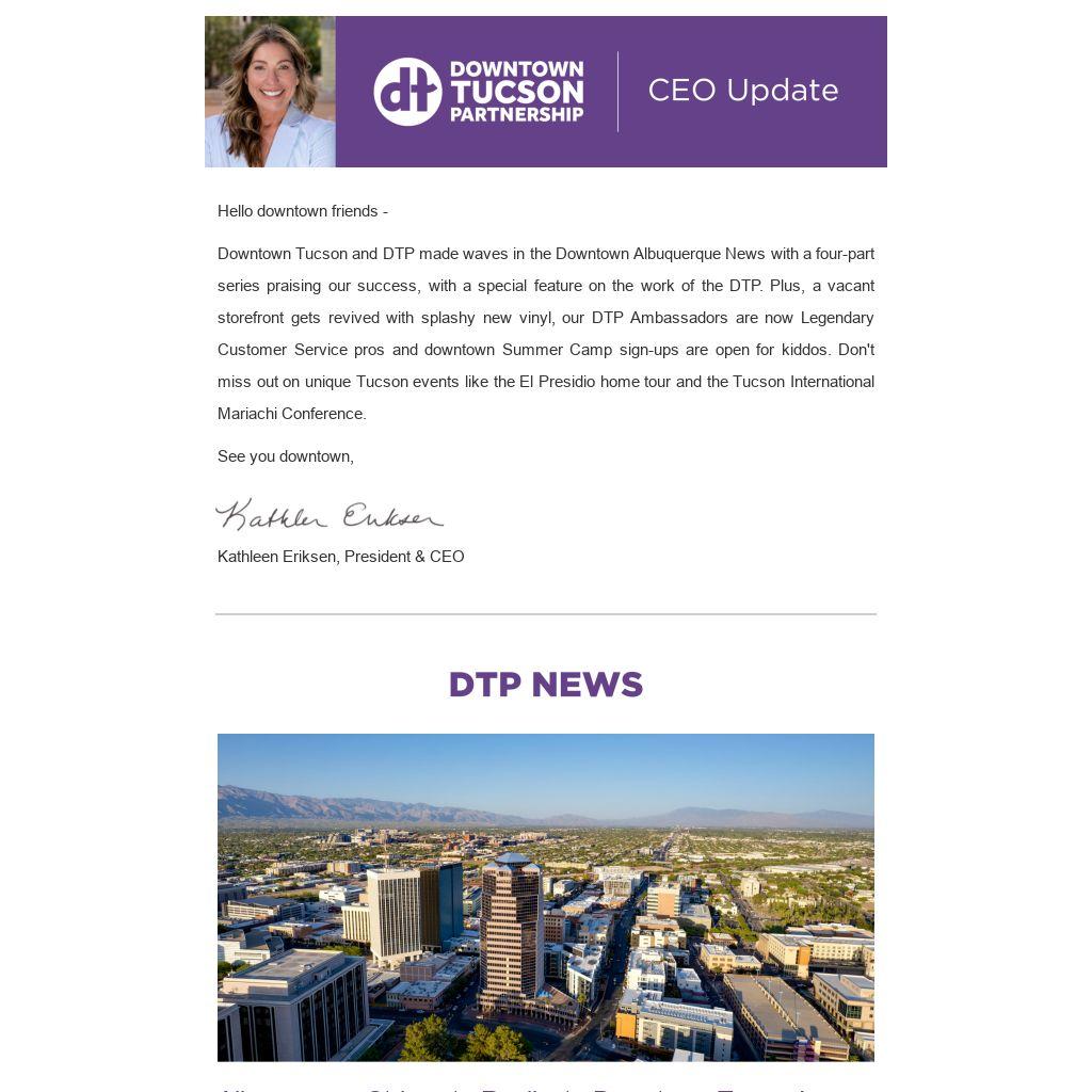 Downtown Tucson and DTP made waves in the Downtown Albuquerque News with a four-part series praising our success, with a special feature on the work of the DTP. Plus, a vacant storefront gets revived with splashy new vinyl, our DTP Ambassadors are now Legendary Customer Service pros and downtown Summer Camp sign-ups are open for kiddos. Don't miss out on unique Tucson events like the El Presidio home tour and the Tucson International Mariachi Conference.
