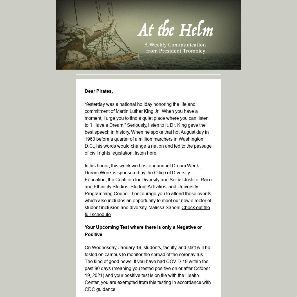 In his honor, this week we host our annual Dream Week. Dream Week is sponsored by the Office of Diversity Education, the Coalition for Diversity and Social Justice, Race and Ethnicity Studies, Student Activities, and University Programming Council. I encourage you to attend these events, which also includes an opportunity to meet our new director of student inclusion and diversity, Malissa Sanon! Check out the full schedule.