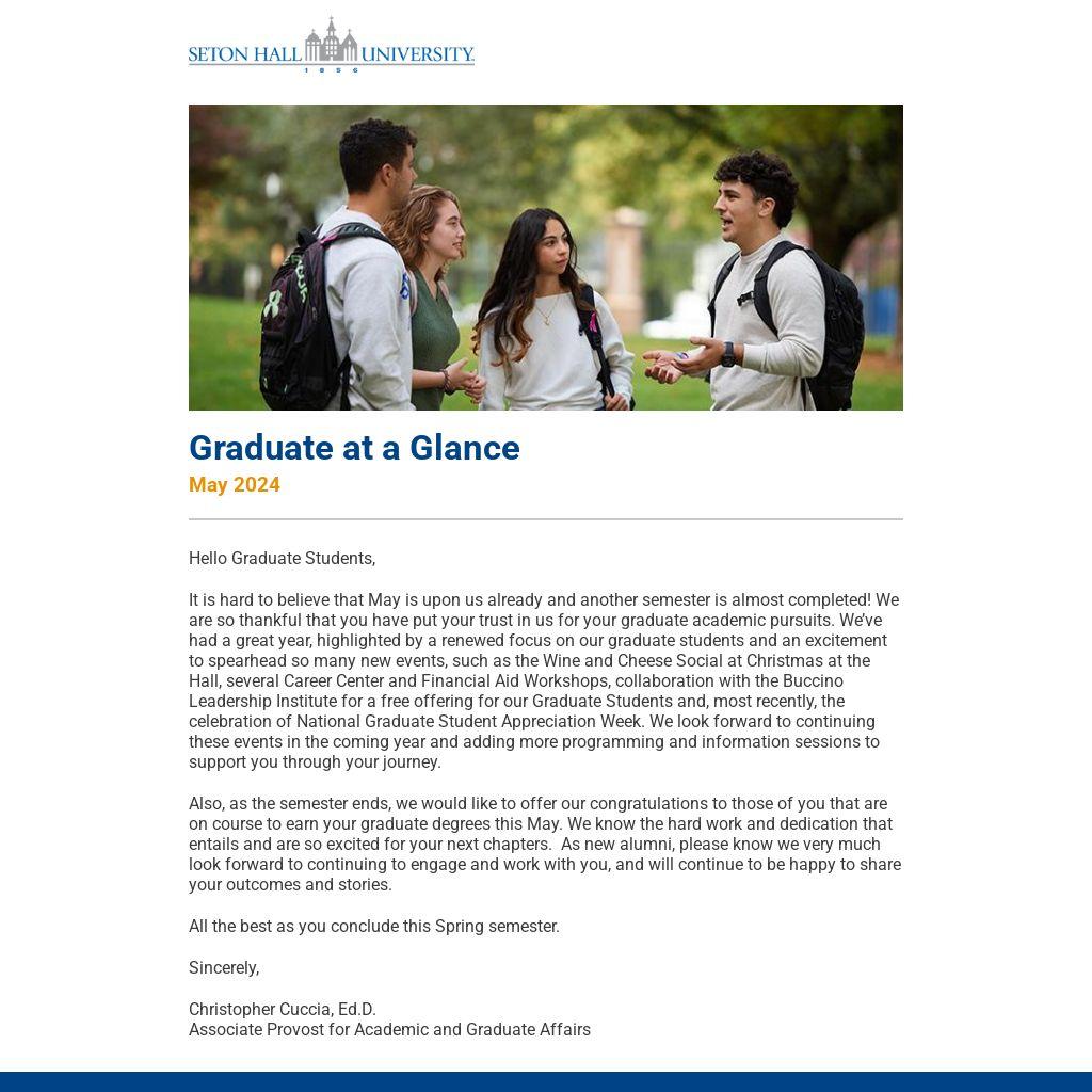 It is hard to believe that May is upon us already and another semester is almost completed! We are so thankful that you have put your trust in us for your graduate academic pursuits. We’ve had a great year, highlighted by a renewed focus on our graduate students and an excitement to spearhead so many new events, such as the Wine and Cheese Social at Christmas at the Hall, several Career Center and Financial Aid Workshops, collaboration with the Buccino Leadership Institute for a free offering for our Graduate Students and, most recently, the celebration of National Graduate Student Appreciation Week. We look forward to continuing these events in the coming year and adding more programming and information sessions to support you through your journey.
