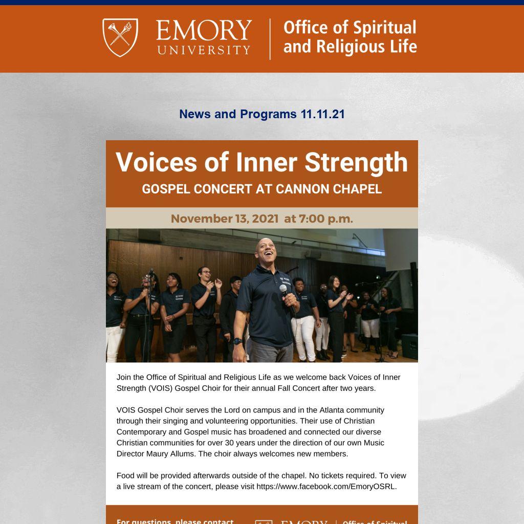 In this season of Thanksgiving, OSRL invites you to join us in giving to support spiritual life at Emory on Giving Tuesday. Gifts made anytime now through Tuesday, November 30 count toward our total. This year, we are emphasizing our Voices of Inner Strength Gospel Choir Fund in order to make VOIS a permanent part of spiritual life at Emory. But you can also support OSRL's many vibrant programs. Thank you for your support, and a Happy and Blessed Thanksgiving to you and yours.