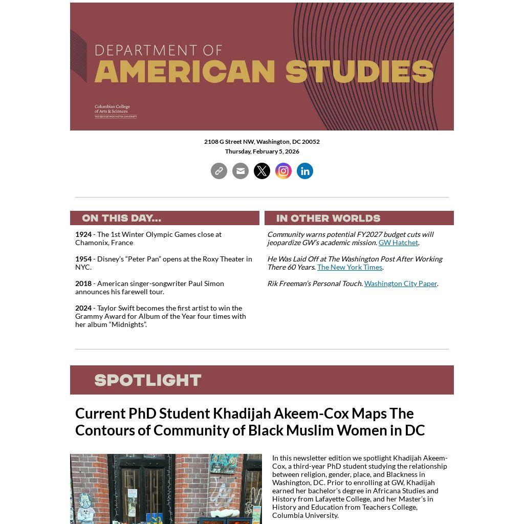 In this newsletter edition we spotlight Khadijah Akeem-Cox, a third-year PhD student studying the relationship between religion, gender, place, and Blackness in Washington, DC. Prior to enrolling at GW, Khadijah earned her bachelor’s degree in Africana Studies and History from Lafayette College, and her Master’s in History and Education from Teachers College, Columbia University.