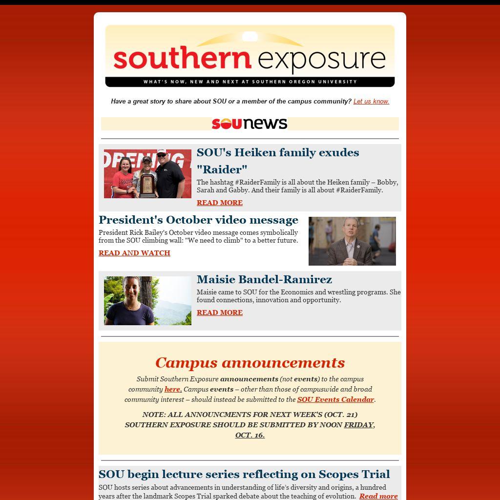Submit Southern Exposure announcements (not events) to the campus community here. Campus events – other than those of campuswide and broad community interest – should instead be submitted to the SOU Events Calendar.